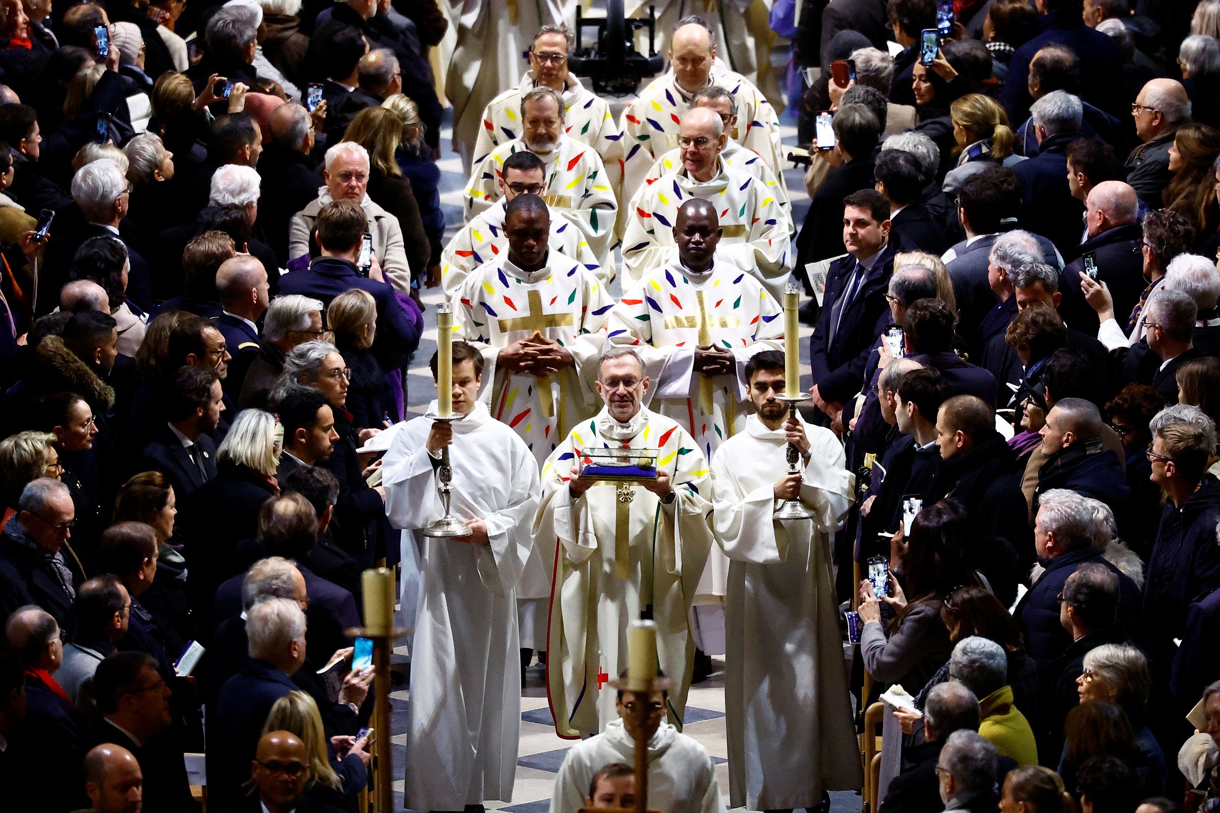Clergy and altar servers process down the aisle led by Father Olivier Ribadeau Dumas, rector-archpriest of Notre Dame Cathedral, for the cathedral's inaugural Mass. Father Dumas was carrying the relics of five Parisian saints and blesseds that later were put inside the altar at Notre Dame Cathedral, five-and-a-half years after a fire ravaged the Gothic masterpiece, as part of ceremonies to mark the cathedral's reopening after its restoration, in Paris, Dec. 8, 2024. (OSV News photo/Sarah Meyssonnier, Reuters)The bishops wore vestments adorned with golden crosses, created by star French designer Jean-Charles de Castelbajac, who was inspired by the large golden cross at the back of the cathedral over its Pieta. Castelbajac is known for his friendship with the late Cardinal Jean-Marie Lustiger, longtime archbishop of Paris.