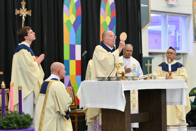 Bishop O'Connell elevates the Eucharist during the Mass he celebrated for the Red Bank Catholic and St. James School communities on Dec. 9. Mike Ehrmann photos