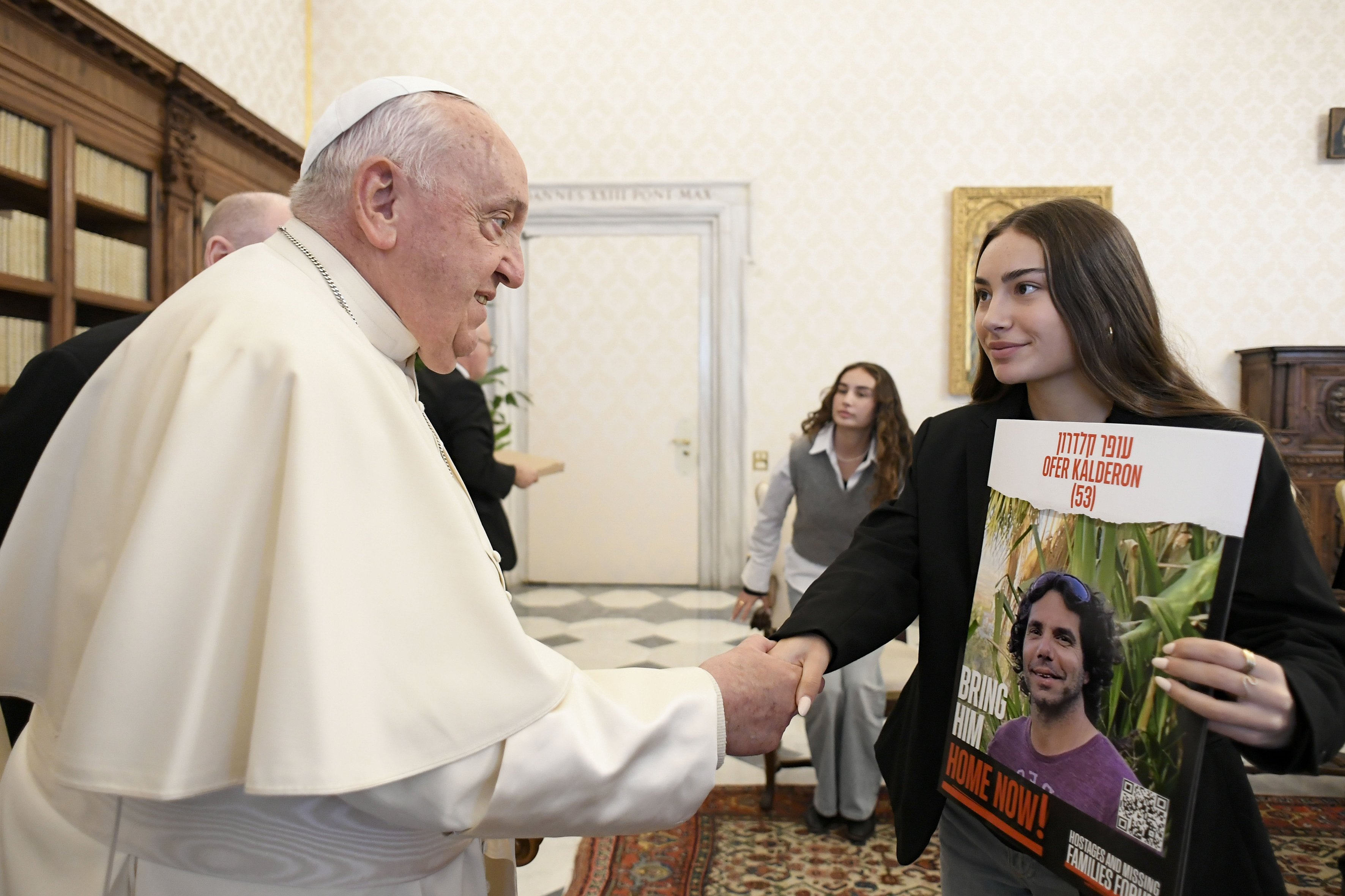Pope Francis shakes hands with Sahar Kalderon who is holding a poster of her father, Ofer Kalderon, during a meeting at the Vatican Nov. 14, 2024. Members of the Kalderon family had been taken hostage by Palestinian militants Oct. 7, 2023, but Sahar and her younger brother, Erez, were later released. (CNS photo/Vatican Media)When the Pope stopped to pray before the Bethlehem creche at the end of his general audience Dec. 11, the baby Jesus statue and kaffiyeh-draped manger were gone. The Vatican press office offered no comment beyond a reminder that traditionally the baby is not placed in a Nativity scene until Christmas Eve.