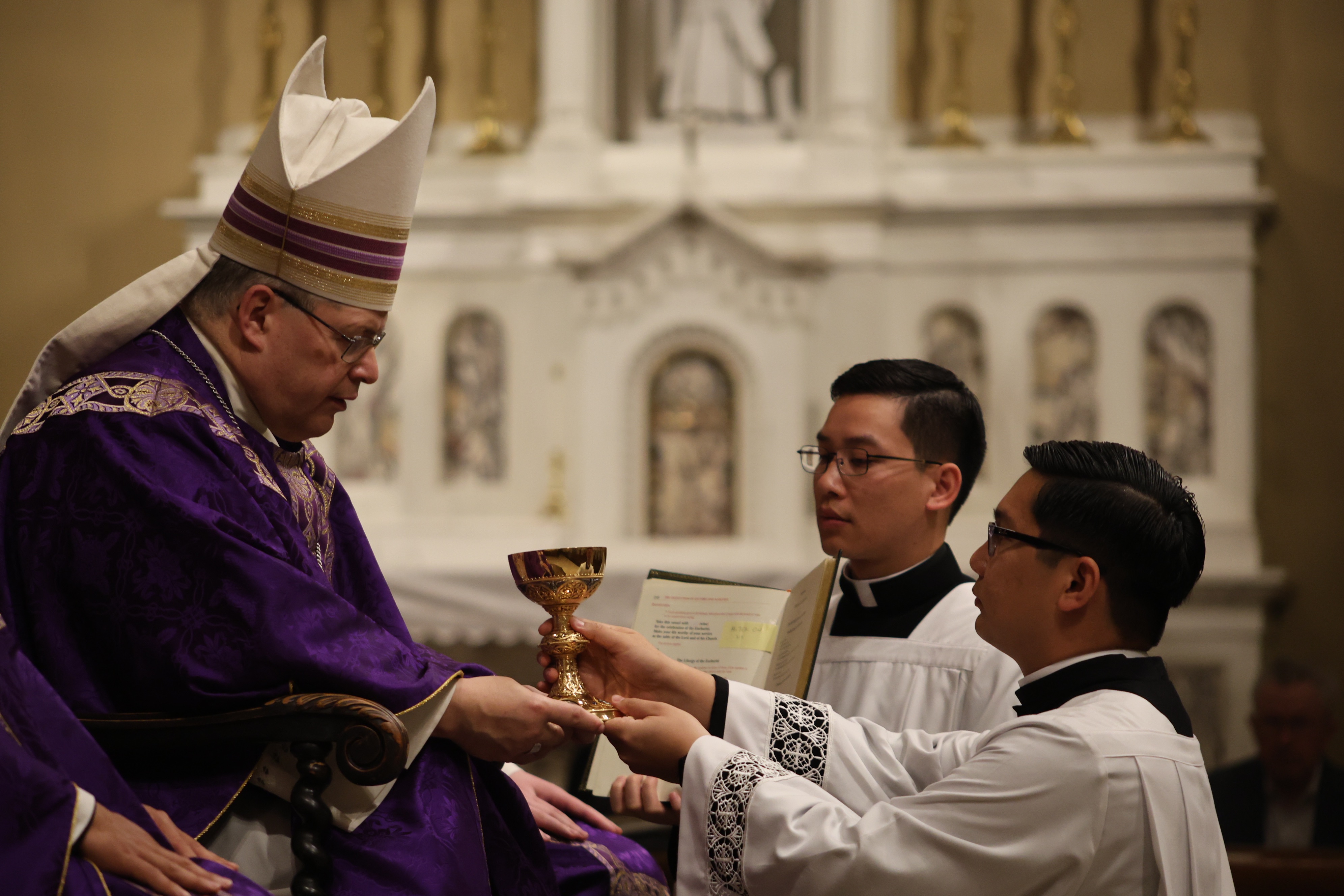 During an April 5 Mass celebrated by Bishop Douglas J. Lucia of Syracuse, N.Y., Brian Leonard was instituted as a lector while Benedict Quiambao and Nicholas Alescio were instituted as acolytes.