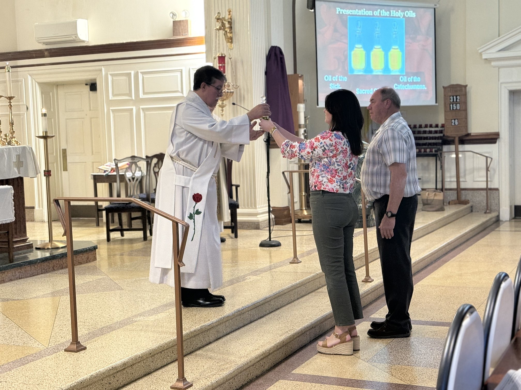 At the start of Mass, parishioners who had experienced the use of the Oil of Catechumens, the Oil of the Sick, and the Holy Chrism during the previous year presented the holy oils to the faith community.