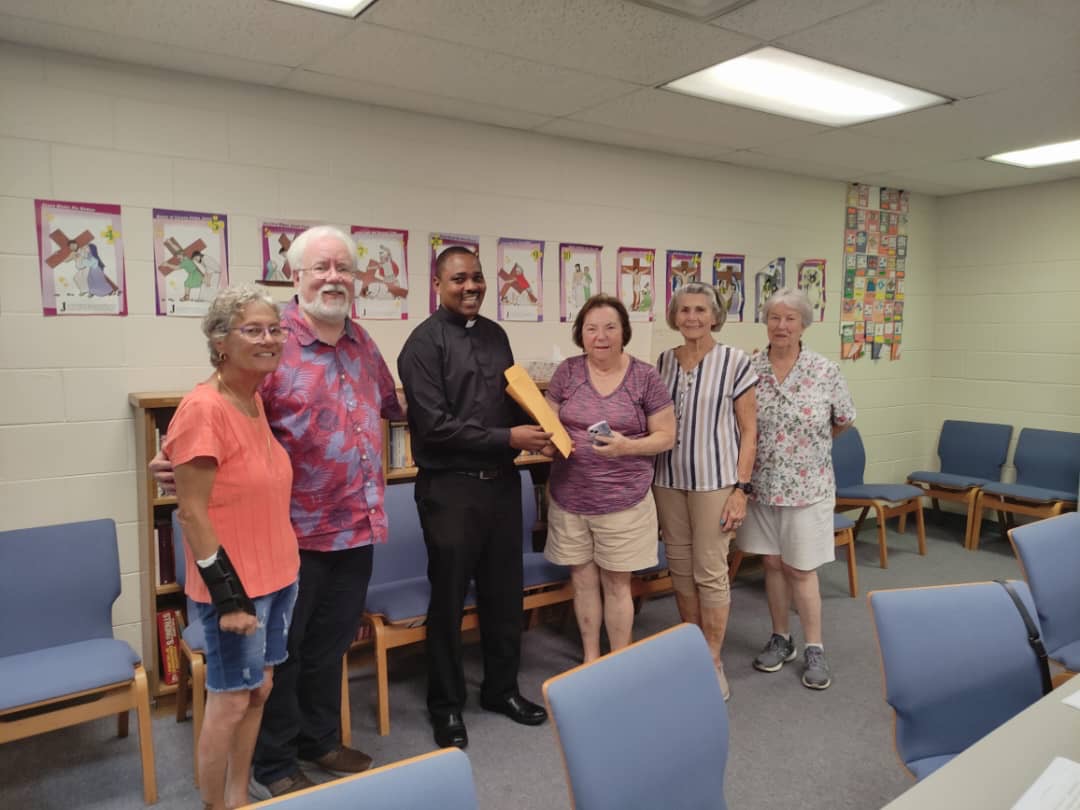 Surrounded by St. Anselm parishioners and Father Brian Butch, pastor, Father Kayemba, center, accepts a collection taken up for livestock for his Rwandan parish.