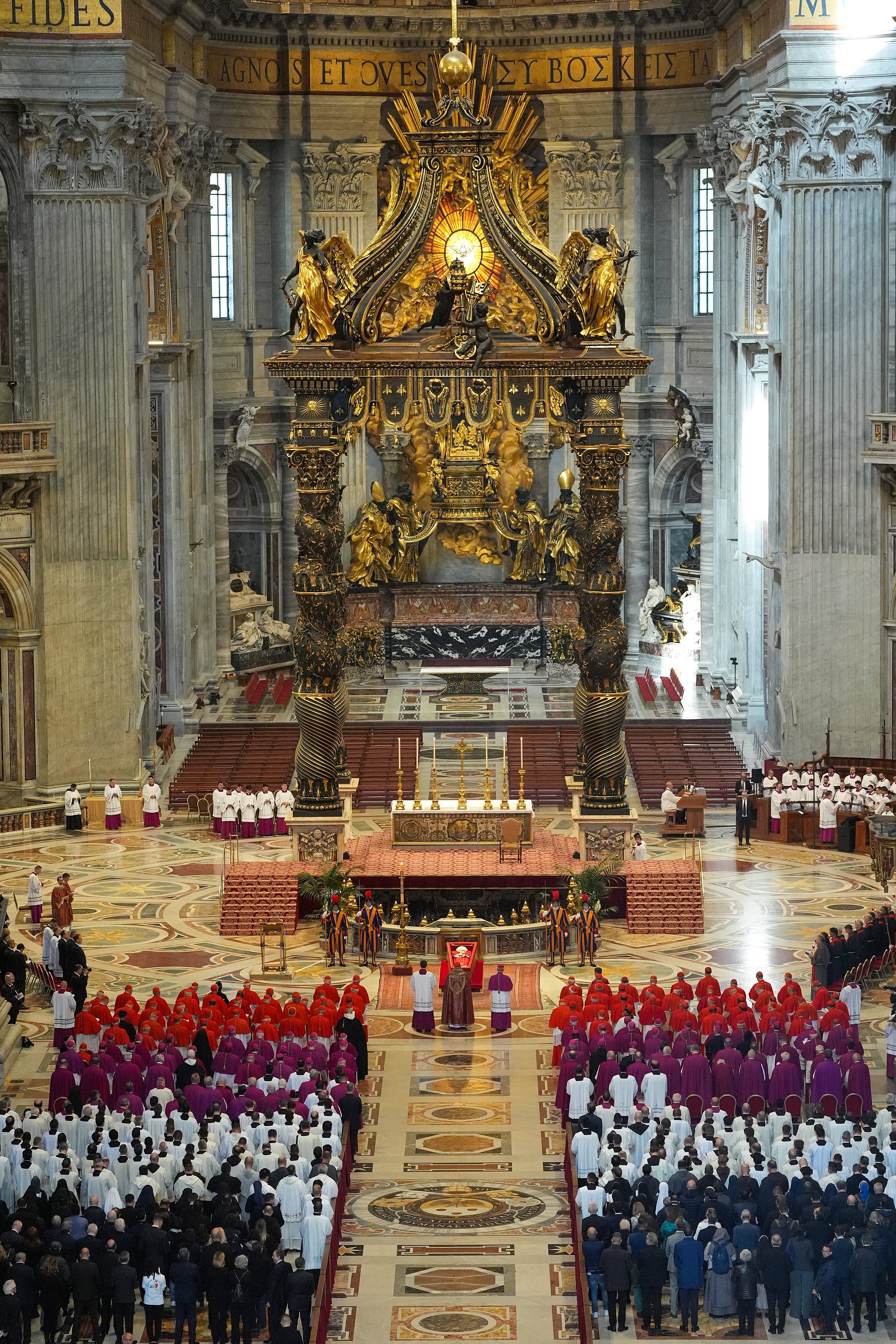 El cuerpo del Papa Francisco, en un ataúd de madera forrado de zinc y cubierto de tela roja, fue colocado ante el altar mayor en una plataforma baja cortada en ángulo para que las personas que acudían a presentar sus respetos pudieran ver su rostro.