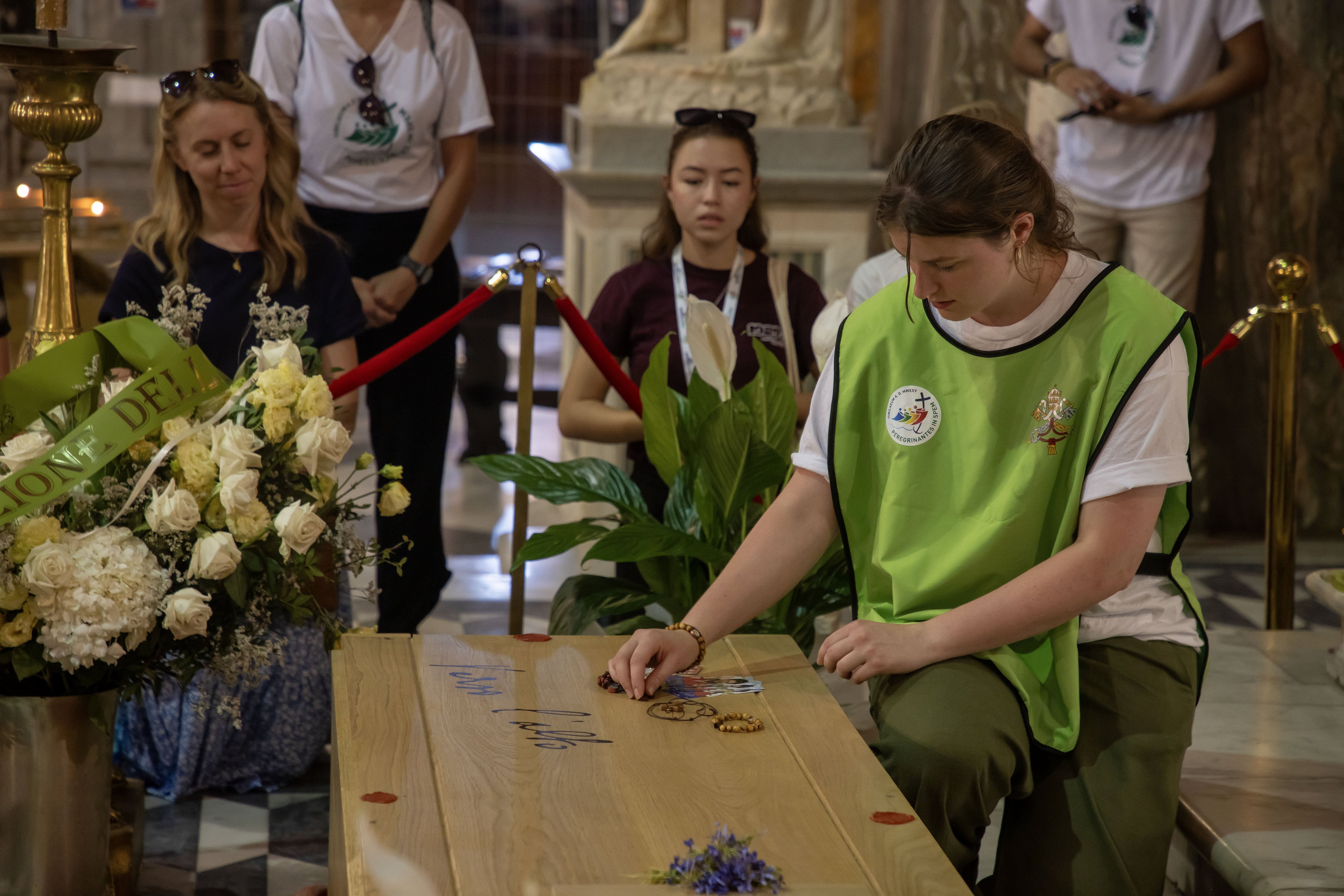 ROME CNS – Volunteers watching over the relics of Blessed Pier Giorgio Frassati gently placed items from the faithful on top of his casket to make a third-class relic for the visitors to the Basilica of Santa Maria sopra Minerva, near Rome's Pantheon, one afternoon during the Jubilee of Youth.