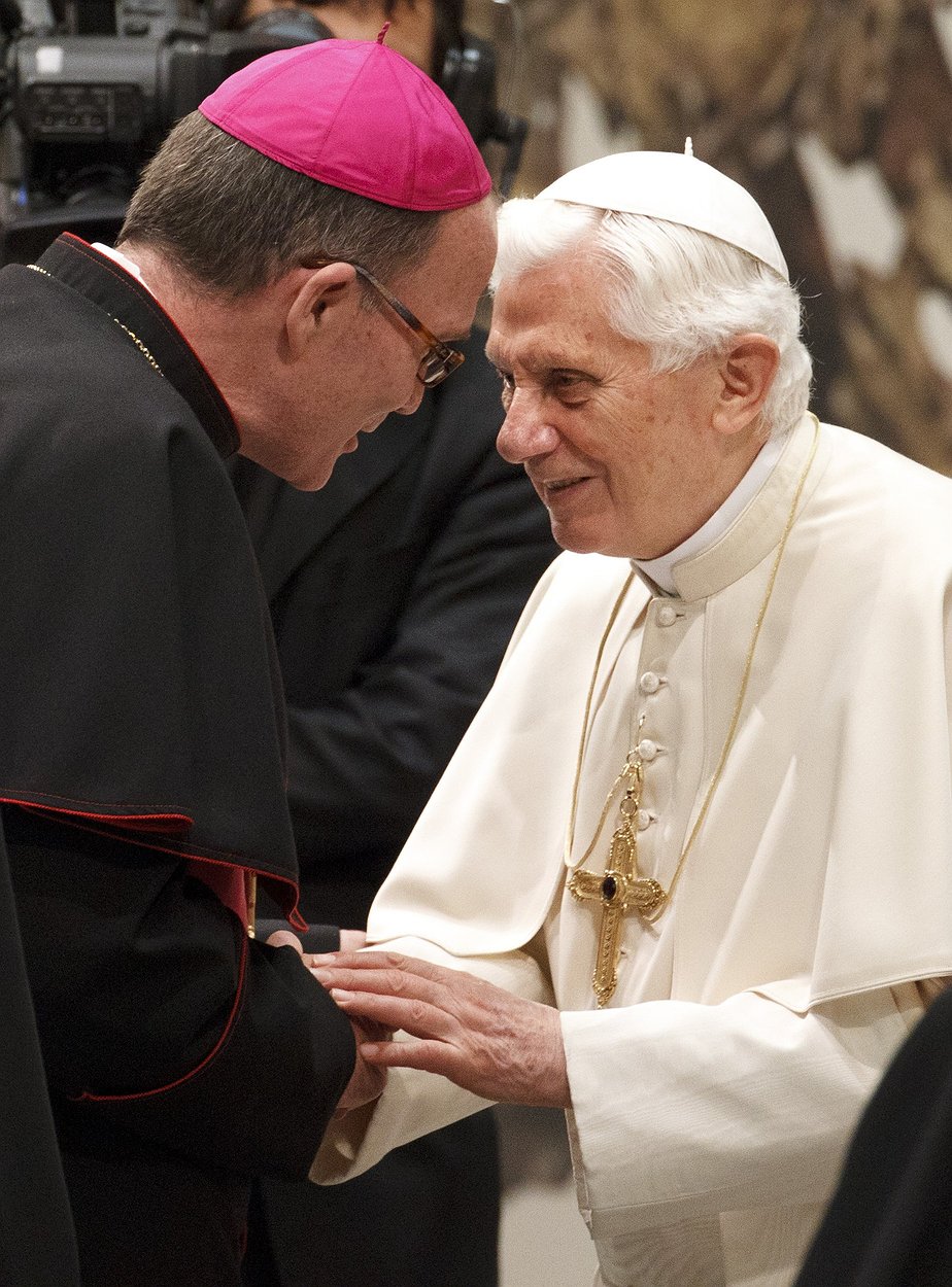 Pope Benedict XVI greets Bishop David M. O'Connell of Trenton, N.J., during his general audience in Paul VI hall at the Vatican Dec. 7. Bishop O'Connell and other New Jersey bishops were making their "ad limina" visits to the Vatican to report on the status of their dioceses. (CNS photo/Paul Haring) (Dec. 7, 2011) See POPE-AUDIENCE Dec. 7, 2011.Paul Haring