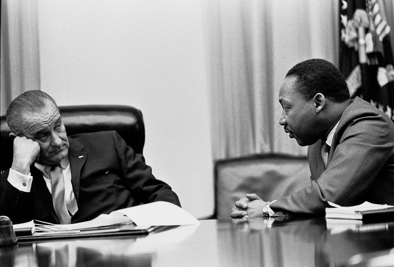 Civil rights leader the Rev. Dr. Martin Luther King Jr. talks with U.S. President Lyndon B. Johnson in this undated photo. Johnson signed the Civil Rights Act into law July 2, 1964. On March 15, 1965, Johnson signed the Voting Rights Act into law. (OSV News photo/Yoichi Okamoto, courtesy LBJ Library)Yoichi Okamoto
