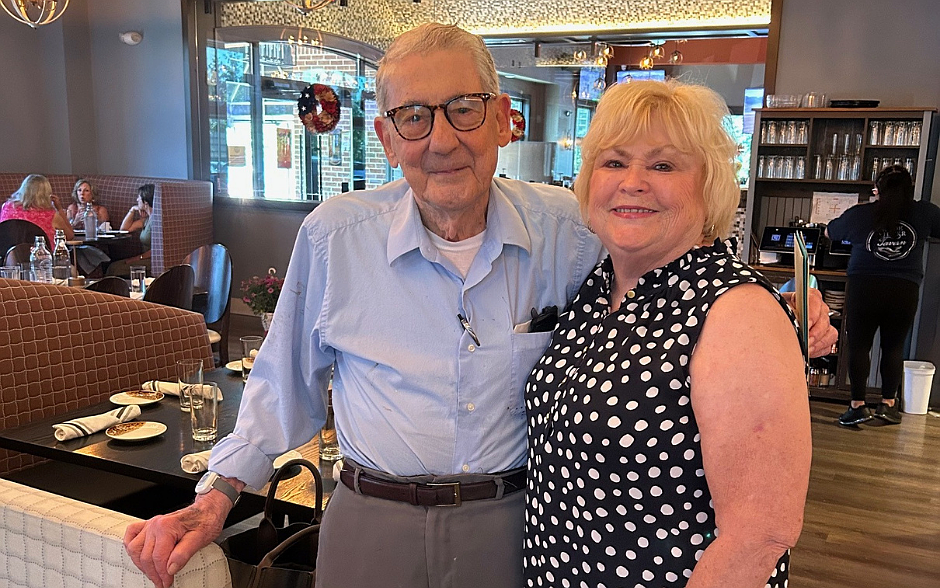 Father William Bausch was recently treated to a special luncheon in celebration of his 70th anniversary of priesthood by a group of parishioners from St. Mary Parish, Colts Neck. Father Bausch served as pastor there from 1973 to 1996. Here Father Bausch is joined by parishioner Marsha Grigoli. Courtesy photo.