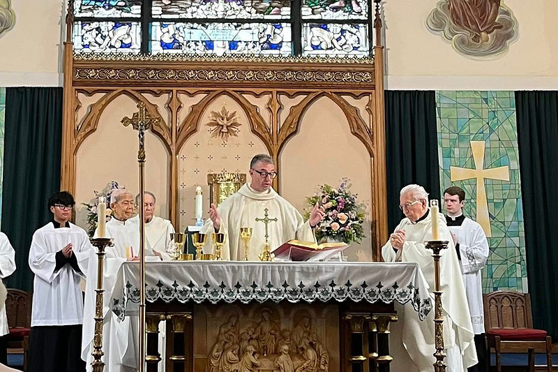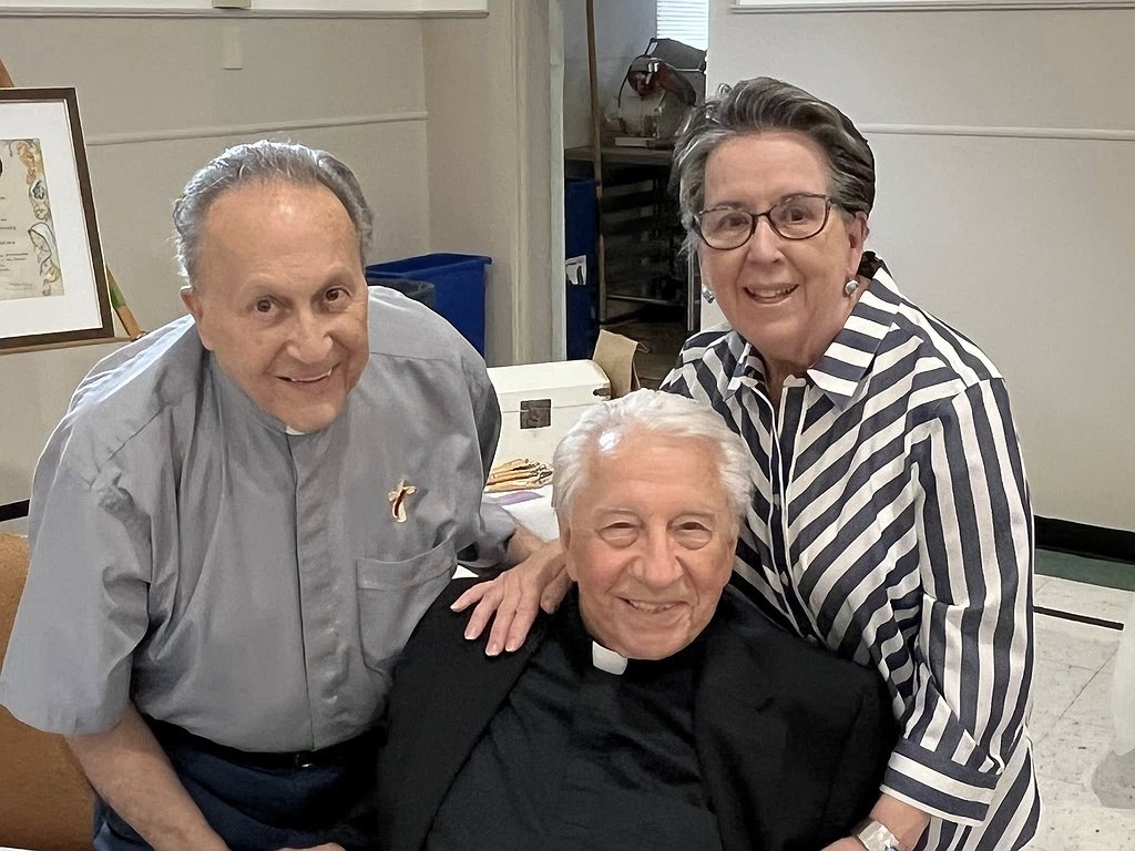 Divine Word Father Martin Padovani, standing to the right of the altar, was recognized for his more than five decades of service in the Diocese of Trenton on June 8. A Mass of Thanksgiving was celebrated in St. Mary Church, Bordentown, with Father Martin O’Reilly, pastor, serving as principal celebrant. After the Mass, a reception was held in the parish school. At left, he is shown with Deacon Larry and Jodie Finn. Father Padovani has moved to Techny, Ill., where he is now living in residence with members of his community. Facebook photos