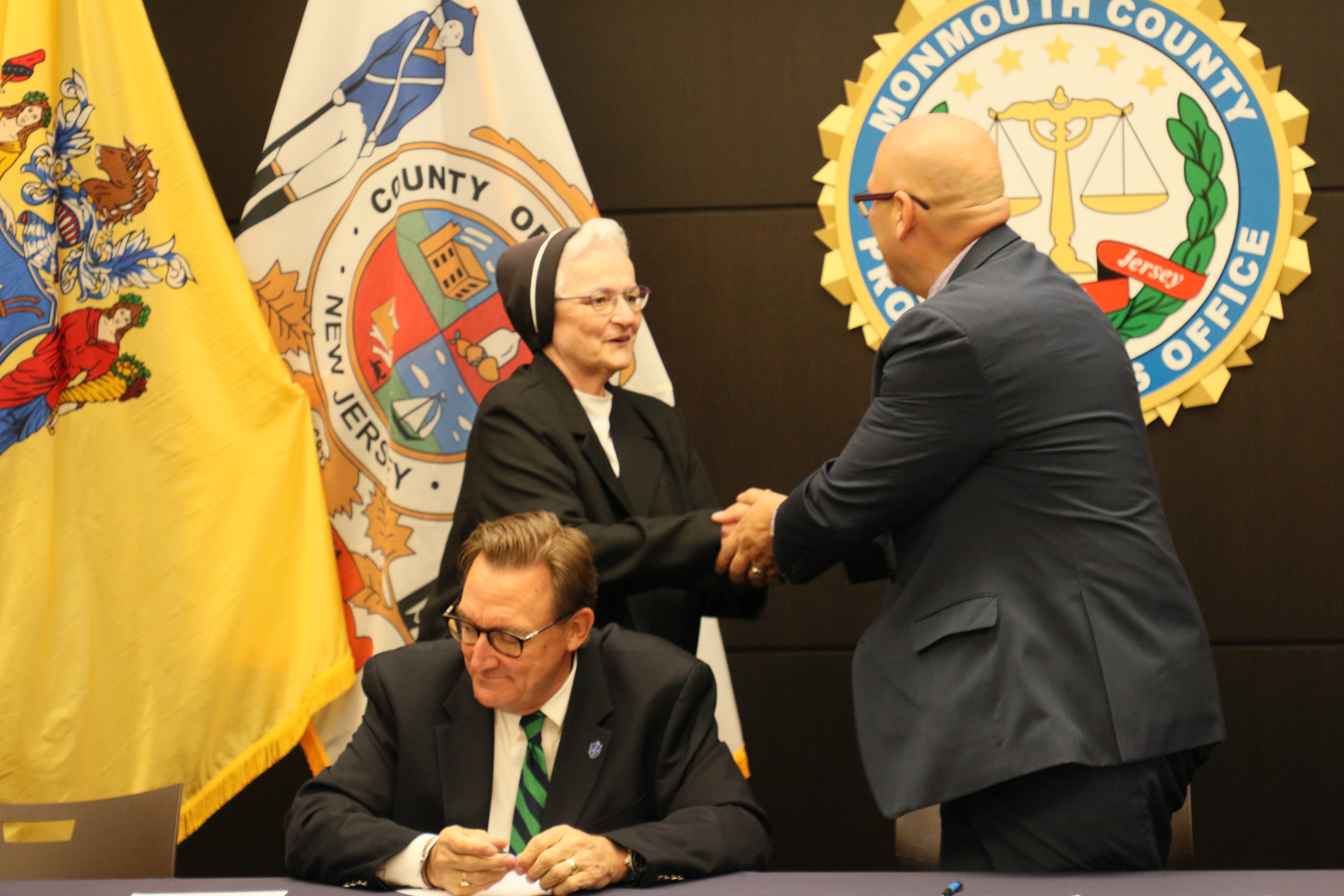 Staff from the diocesan Department of Catholic Schools, including Dr. Vincent de Paul Schmidt, superintendent, and Bonnie Milecki, assistant superintendent of development and operations, met with Monmouth County Prosecutor Raymond S. Santiago Aug. 26for the signing of a renewed memorandum of agreement between their respective organizations. The MOA is created to ensure cooperation between law enforcement and Catholic schools countywide with the goal of working together to address problems and emergencies. In his remarks, Dr. Schmidt reflected on the day’s significance saying that “it is an important moment for our Catholic schools in Monmouth County. This Memorandum of Agreement reflects the strong partnership between school leadership and law enforcement, but on our shared commitment to keeping students and the community safe.” In Monmouth County, there are three Catholic high schools and 10 grammar schools serving either pre-kindergarten or kindergarten through eighth grade. Staff photo