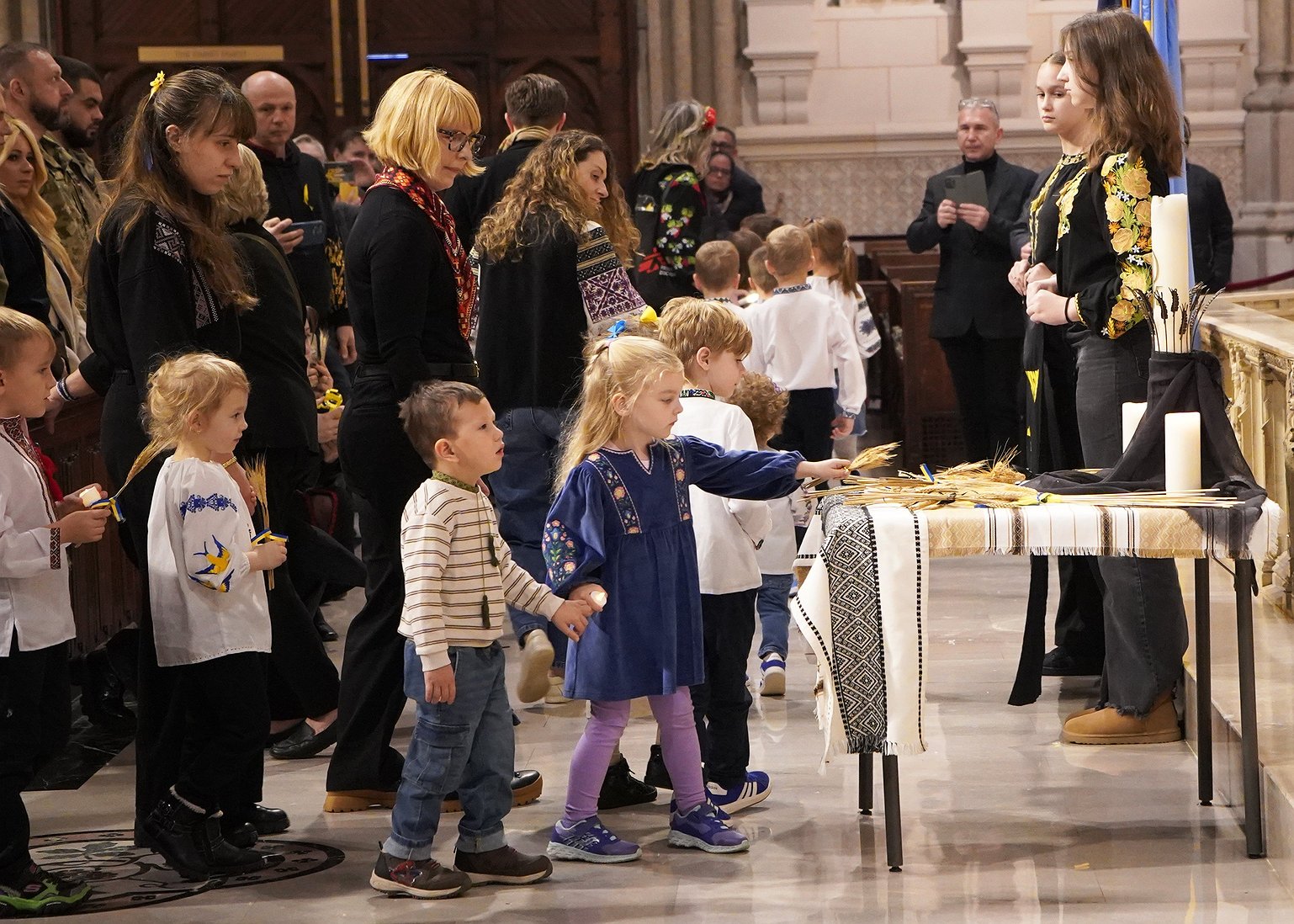 Children place symbolic wheat stalks before a candle during a Nov. 22, 2025, prayer service at St. Patrick's Cathedral in New York commemorating millions of Ukrainians killed in the Holodomor, an artificial famine engineered by Soviet dictator Joseph Stalin in 1932-1933. Speakers at the annual prayer service drew chilling parallels between Stalin’s campaign and current Russian attacks on Ukraine, which are approaching the 12-year mark, and which like the Holodomor have acutely impacted children in particular. (OSV News photo/Archeparchy of Philadelphia)The gathering took place on Holodomor Remembrance Day, celebrated each year on the fourth Saturday of November.