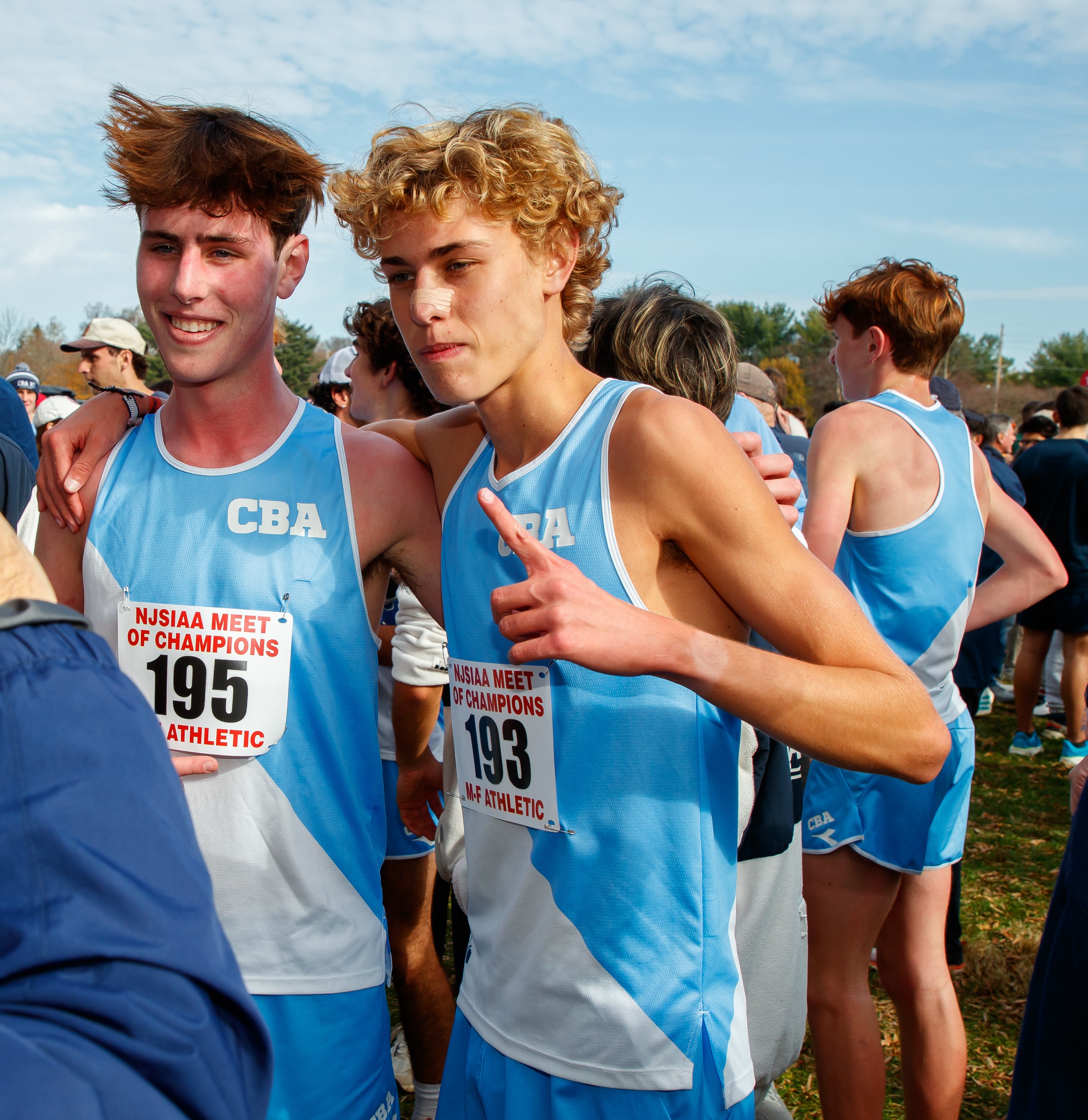 Gavin Schmitt (left) and Luke Hnatt rejoice after Hnatt took first and Schmitt claimed second at the Meet of Champions. Photo by Larry Levanti/https://larrylevanti.comIn the Nov. 15 Meet of Champions at Holmdel Park, CBA won its fourth straight title and record 28th overall. The Colts broke the course record of 15:42 they set last year by averaging 15:40 this time. Hnatt was CBA’s third straight individual MOC winner in a time of 15:23. Junior Gavin Schmitt was second in 15:27.