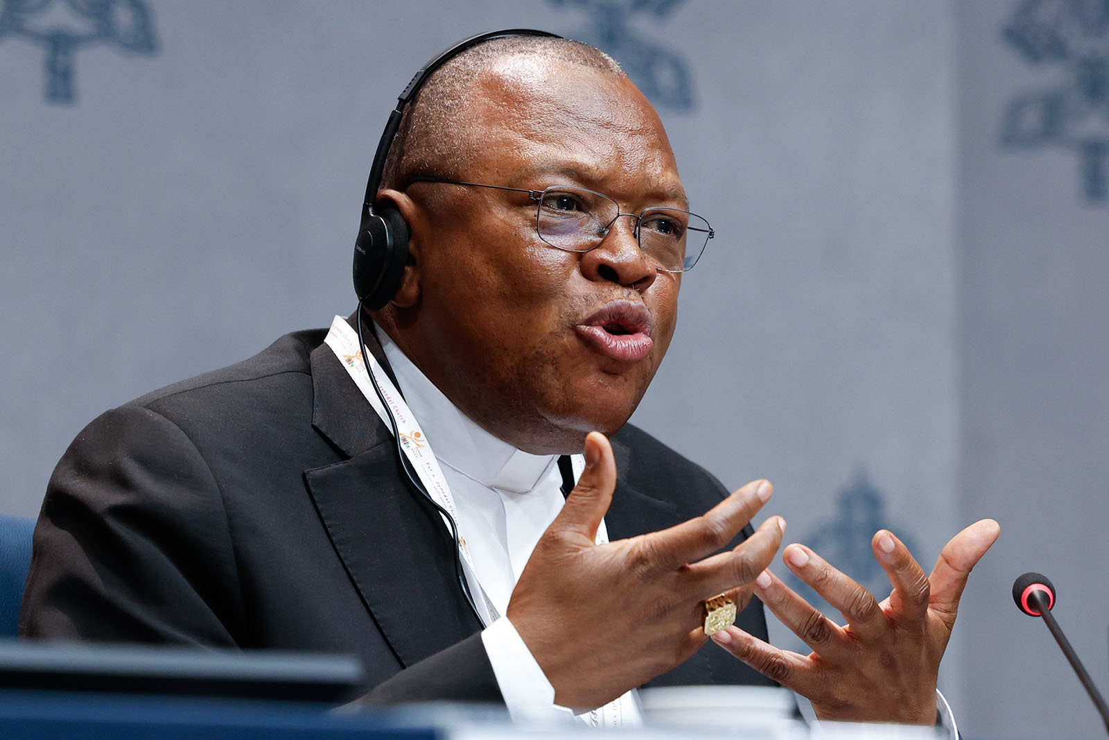 Cardinal Fridolin Ambongo Besungu of Kinshasa, Congo, speaks at a press briefing Oct. 22, 2024, about the Synod of Bishops at the Vatican. CNS photo/Lola Gomez