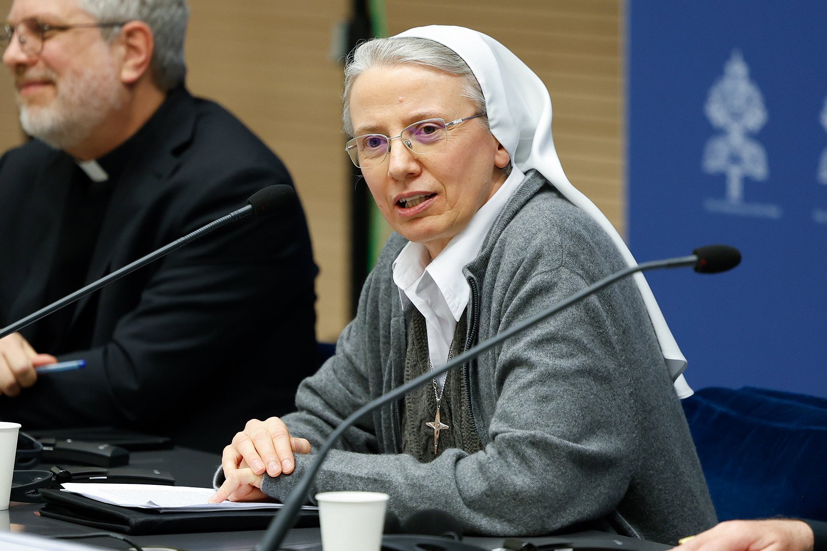 Consolata Missionary Sister Simona Brambilla, secretary of the Dicastery for the Institutes of Consecrated Life and the Societies of Apostolic Life, speaks during a news conference at the Vatican March 14, 2024, about study groups authorized by Pope Francis to examine issues raised at the synod on synodality. (CNS photo/Lola Gomez).The Vatican press office did not reply to requests to explain why the cardinal was given the title pro-prefect or how his role would be different from that of a dicastery secretary.