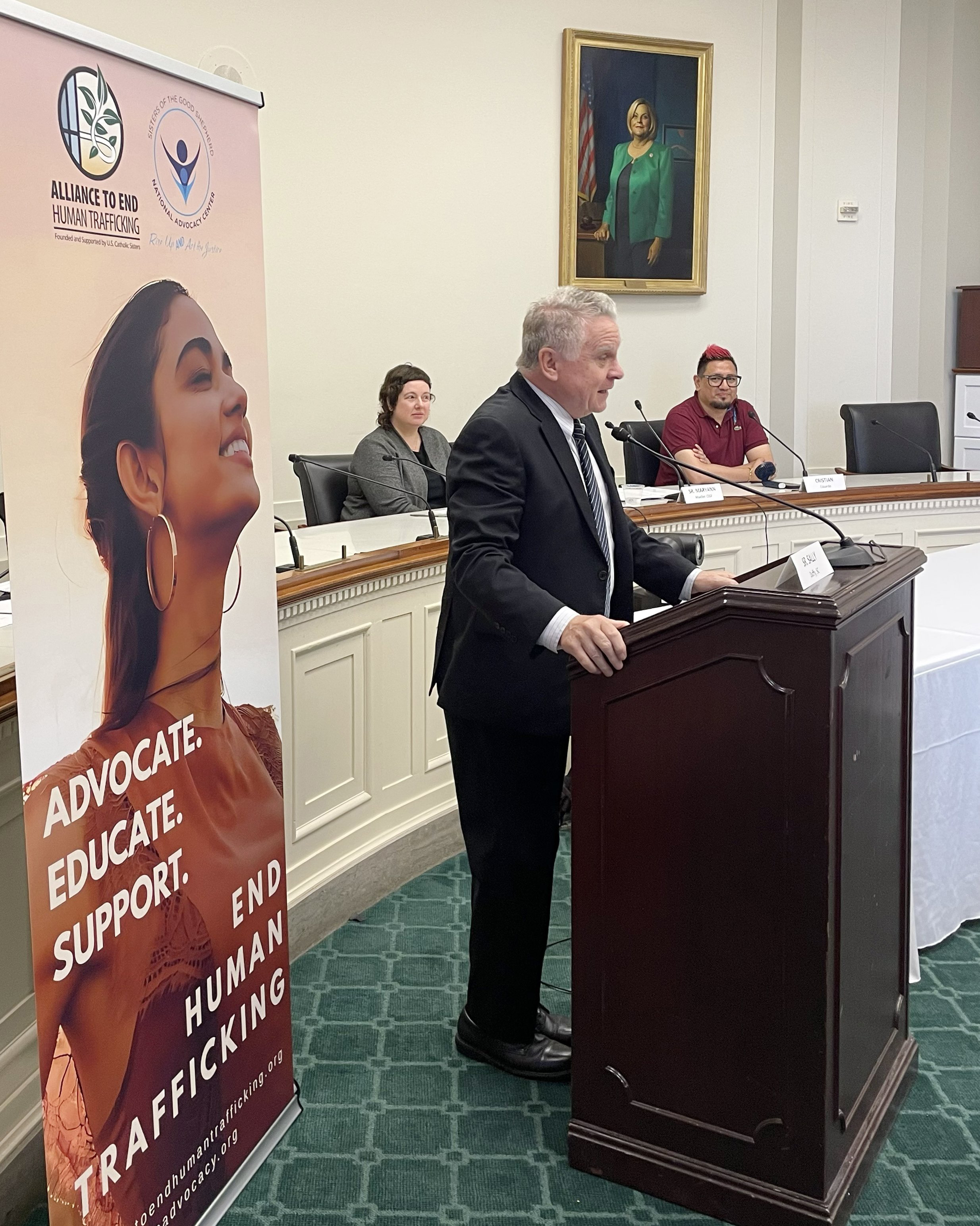 Rep. Chris Smith, R-N.J., speaks at a July 16, 2025, Capitol Hill press conference about three new pieces of legislation designed to both help victims of human trafficking and enhance safety for children online. OSV News photo/courtesy of the Alliance to End Human TraffickingWASHINGTON – Two Catholic service organizations have joined forces to back three new pieces of legislation designed to both help victims of human trafficking and enhance safety for children online.