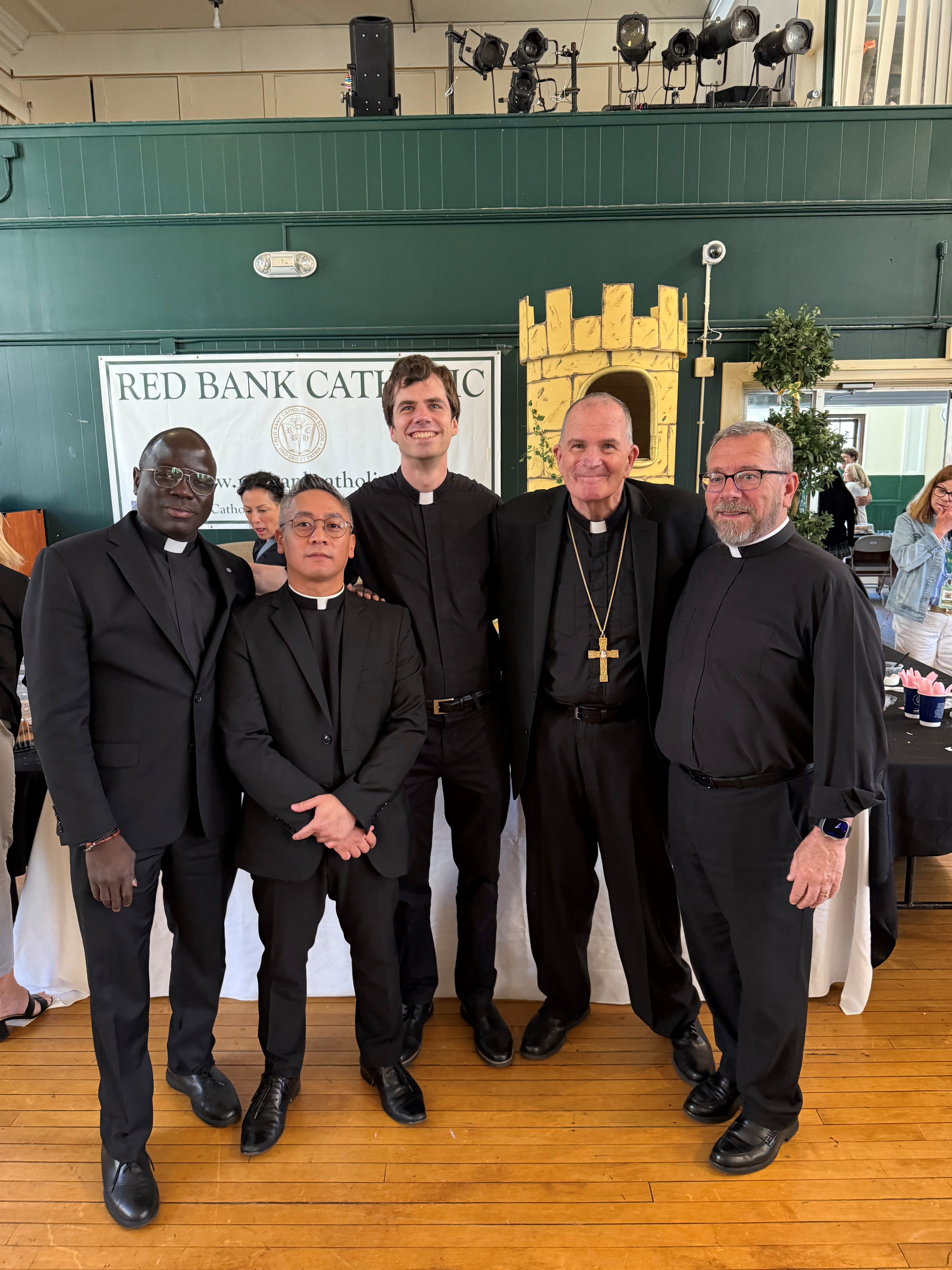 Bishop O'Connell and Father Jean Felicien, the Bishop's priest secretary, left, pose for a photo with the priests who serve St. James Parish, Red Bank, parochial vicars, Father Al Gamalo and Father Wynne Kerridge, and Msgr. Joseph Rosie, pastor, at right. Staff photo