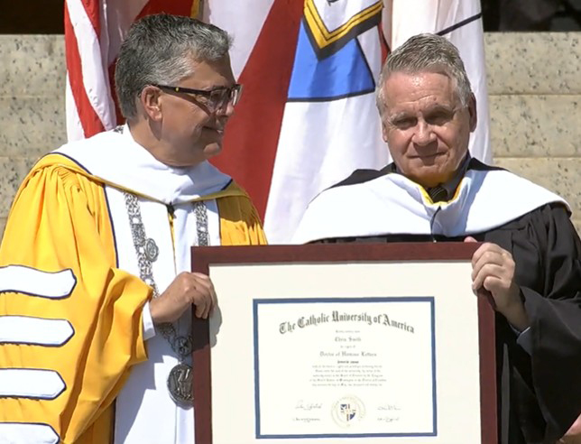 Smith was presented with the honorary Doctor of Humane Letters degree, or “Honoris Causa,” by CUA President Peter Kilpatrick, joining other honorary degree recipients the University has conferred since 1896, including presidents Calvin Coolidge, Franklin Roosevelt, Dwight Eisenhower and Lyndon Johnson, as well as Rev. Mother (now Saint) Katharine Drexel, Archbishop Fulton J. Sheen, Cardinal John O'Connor and others.