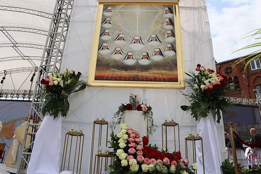 A painting is seen during a ceremony on May 31, 2025, in Braniewo, Poland, as the church beatifies 15 nuns from the Congregation of St. Catherine Virgin and Martyr, martyred in 1945 during the brutal final months of World War II. The sisters chose to stay behind to care for the sick and vulnerable as Soviet troops advanced, ultimately dying at the hands of soldiers while defending their faith, purity, and dignity. Cardinal Marcello Semeraro, prefect of the Dicastery for the Causes of Saints, presiding as the pope’s envoy, called their martyrdom a "supreme testimony of faith" and a challenge to today’s culture of hatred and division. (OSV News photo/courtesy Polish bishops' conference)"Sister Krzysztofa Klomfass and her 14 companions offer us today a special lesson – resilience in the face of a culture of hatred and division, so prevalent in our society today," Cardinal Semeraro said.