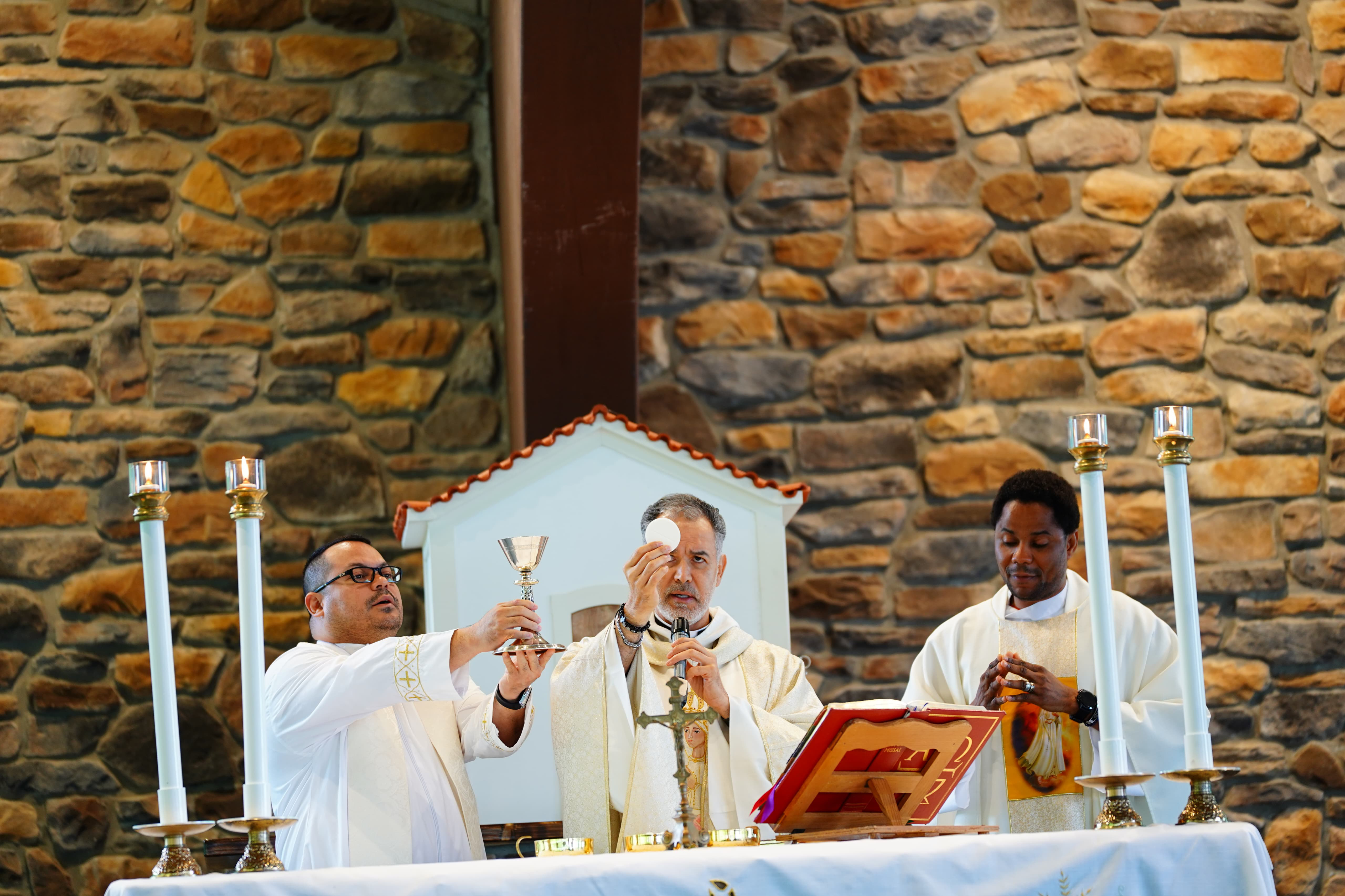 Father Javier Diaz, center, pastor of Christ the King Parish, served as principal celebrant of a Mass in the Blue Army Shrine for those men who participated in the Mass on the Mountain event on June 14. Jose Santiago photos