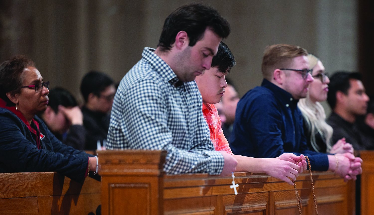 People pray during a March 2, 2025, Mass at the Basilica of the National Shrine of the Immaculate Conception in Washington offered for the intentions of Pope Francis, who has been hospitalized since Feb. 14. Msgr. Walter Rossi, rector of the national shrine, led the faithful in praying the rosary after the Mass, which was celebrated by Cardinal Christophe Pierre, the apostolic nuncio to the United States. (OSV News photo/Mihoko Owada, Catholic Standard)Psalm 92 also says, "The just … shall bear fruit even in old age … declaring how just is the Lord, my rock, in whom there is no wrong." Cardinal Pierre noted how in the daily reports on Pope Francis's health, "there is a simple phrase that has been repeated, which we might pass over easily. It is said, 'he remains in good spirits.'"
