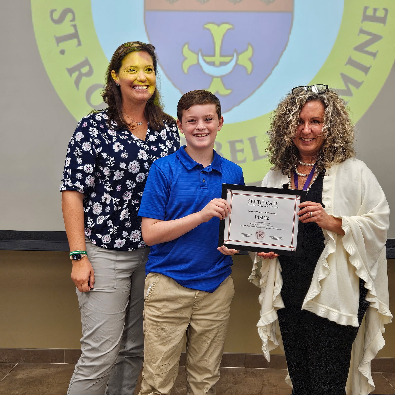 Tyler Coe of St. Ann School, Lawrenceville, receives a certificate for his award-winning essay from Jessica Jarmer, while his proud mom looks on.
