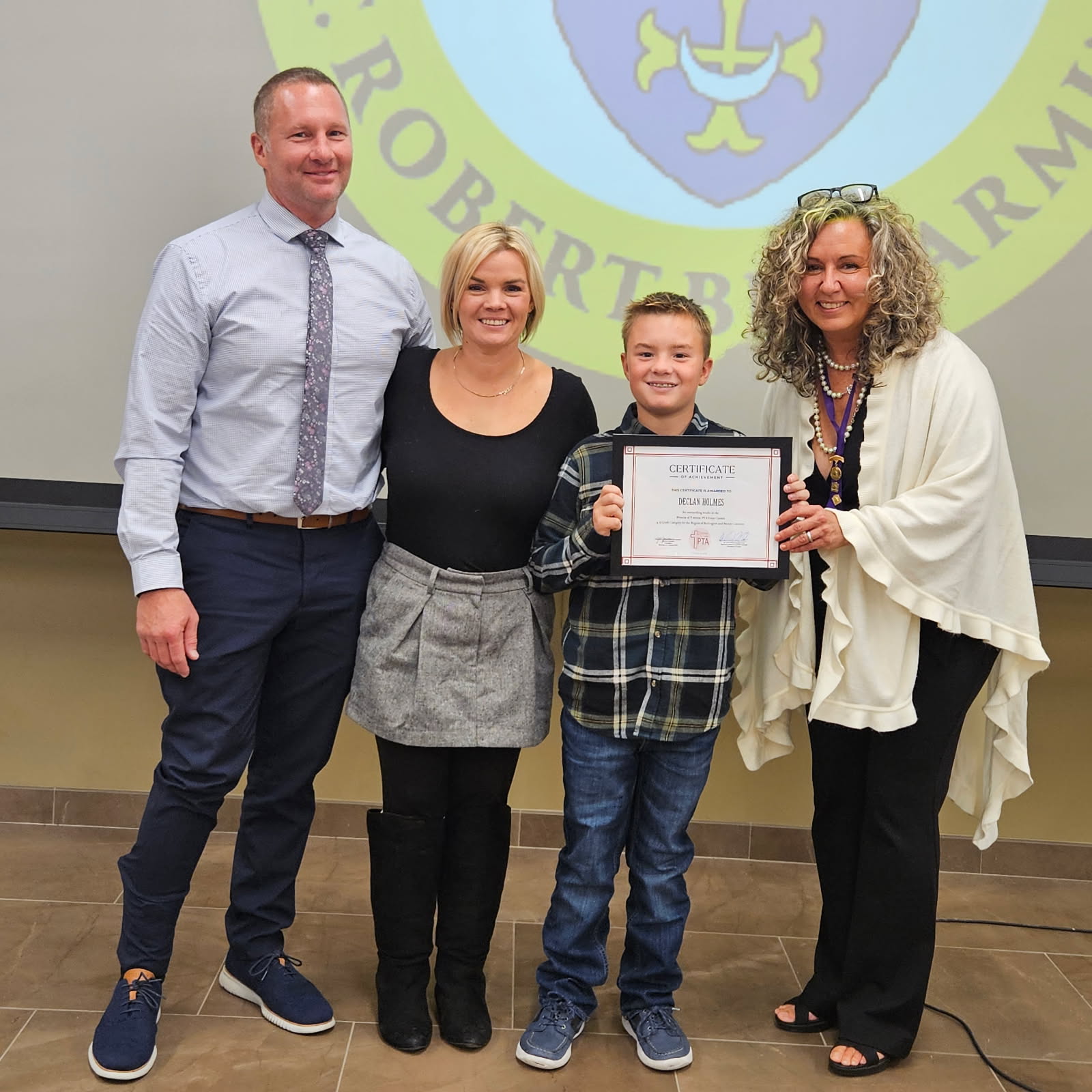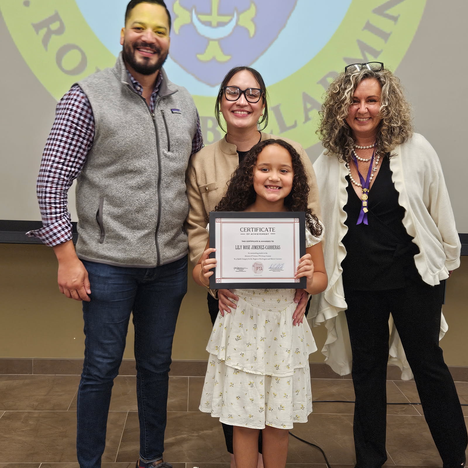 Lily Rose Jimenez-Carreras, from St. Paul School, Burlington, proudly holds her new certificate as her parents and Jessica Jarmer look on. Burlington-Mercer Division