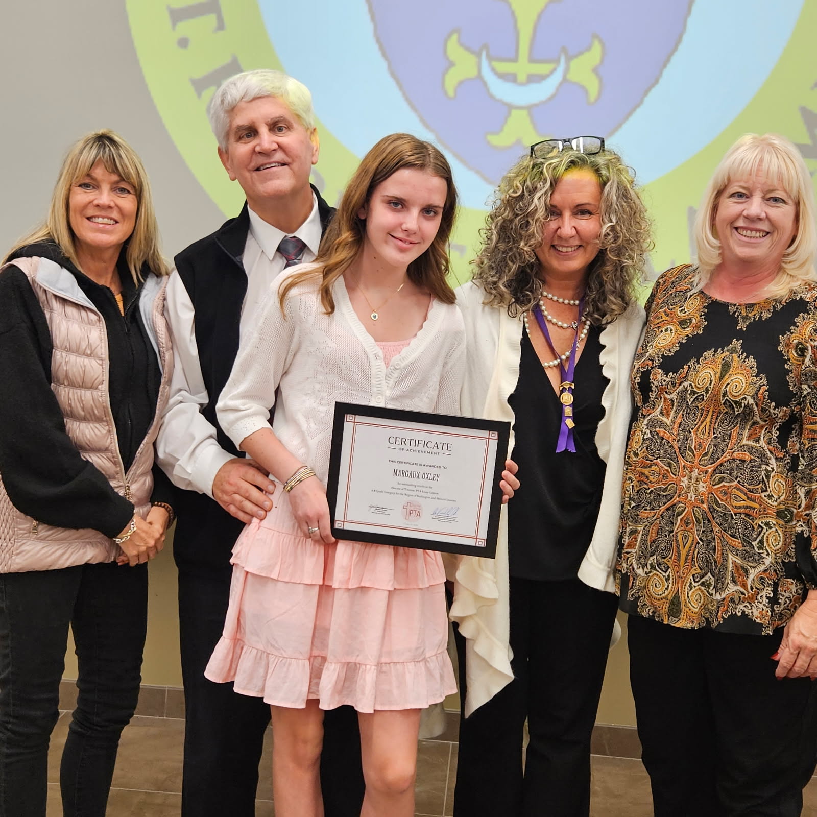 Surrounded by family members, Margaux Oxley, a student in St. Leo the Great School, Lincroft, receives her award from Jessica Jarmer.