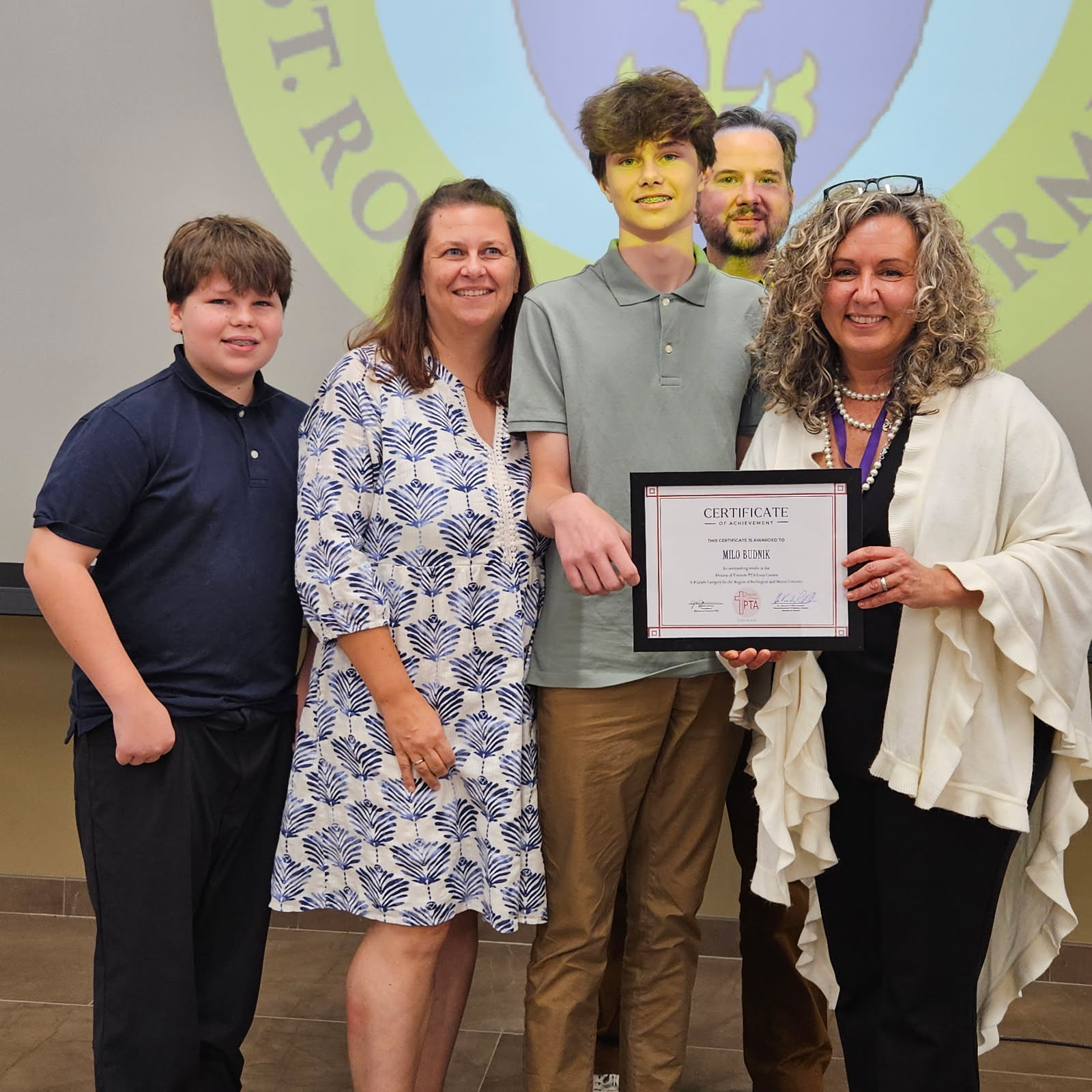 Milo Budnick is surrounded by his family as he is presented with his award by Jessica Jarmer.