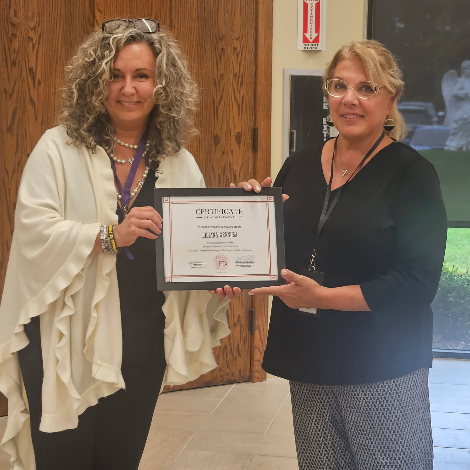 Jessica Jarmer, left, Diocesan PTA president, presents Liliana Gennusa's certificate to a representative from St. Rose School, Belmar. Monmouth-Ocean Division