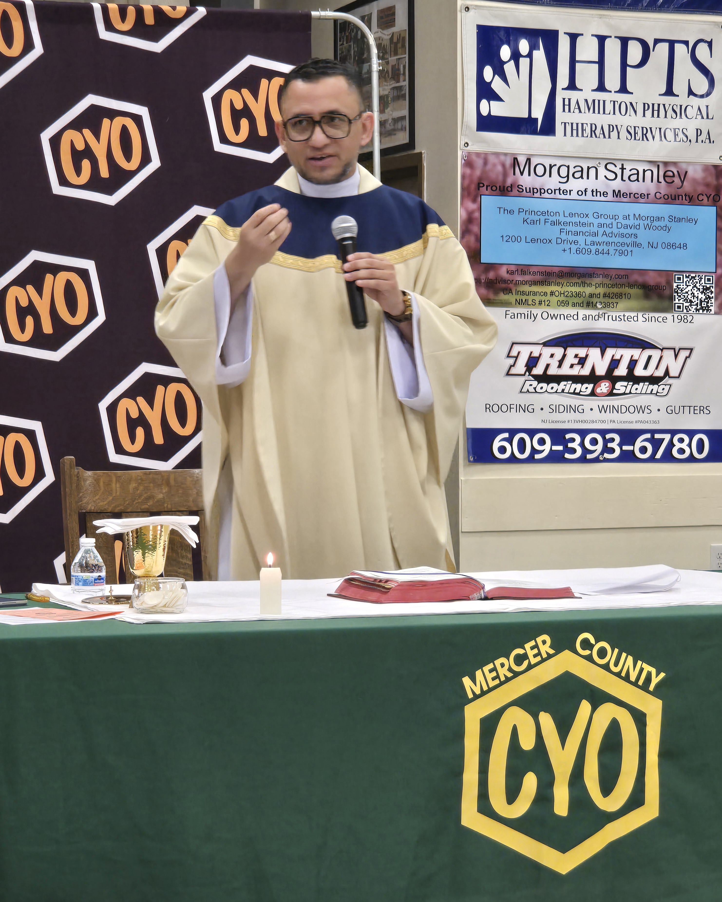 Rev. Arian Wharff of St. Anthony of Padua delivers his message to parents and players at the 73rd Annual Mercer County CYO Basketball and Cheerleading Opening Day Mass. Photo by Rich Fisher Father Wharff’s message was simple. He asked all in attendance to think about their specific talent.