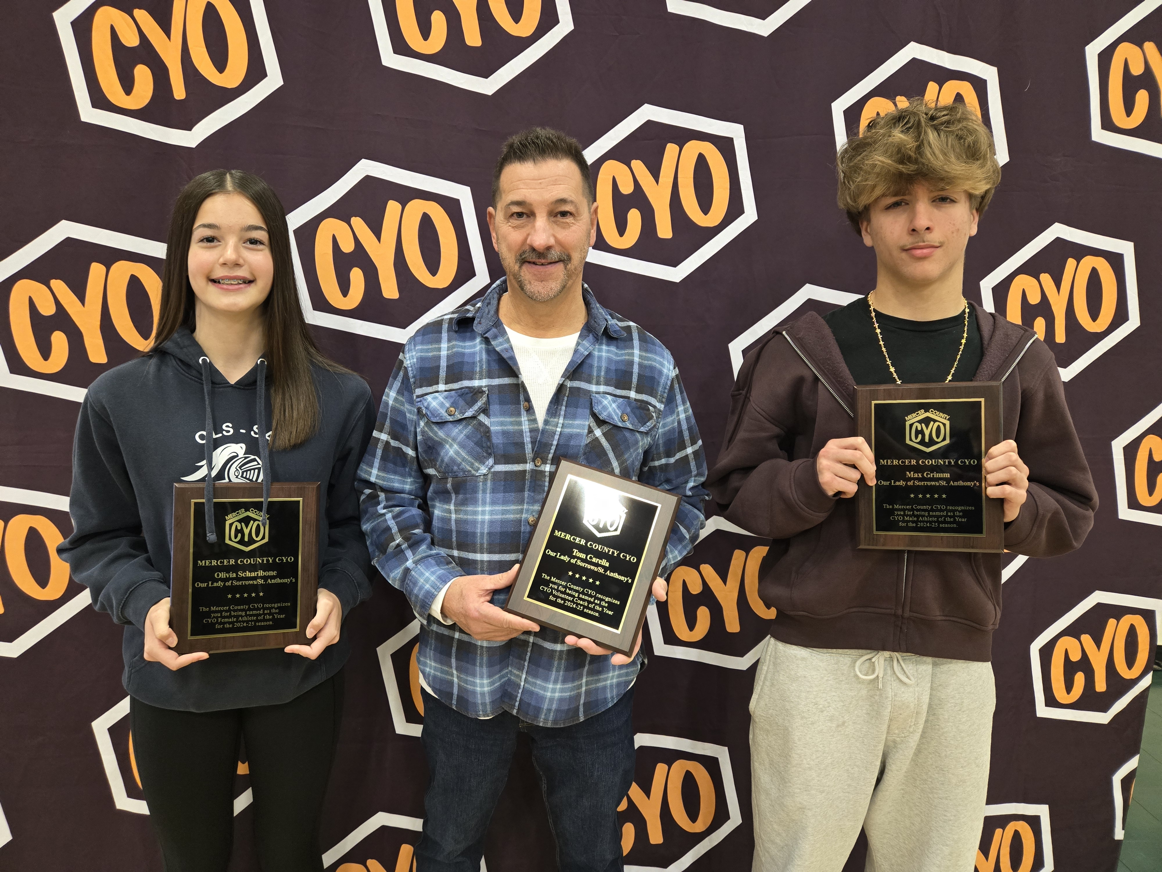 It was an Our Lady of Sorrows/St. Anthony's clean sweep as (from left to right) Olivia Scharibone was the Mercer County CYO 2024-25 Female Athlete of the Year, Tom Carella was Volunteer Coach of the Year and Max Grimmm was Male Player of the Year. Photo by Rich Fisher All three of the 2024-25 major award winners hailed from Our Lady of Sorrows. Scharibone was Female Athlete of the Year, Max Grimm was Male Athlete of the Year and Tom Carella was Volunteer Coach of the Year.