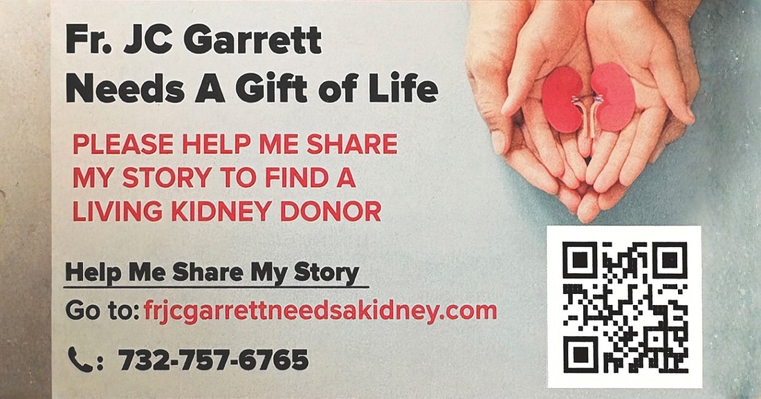 I am Father J.C. Garrett, a priest of the Diocese of Trenton since 2004, and I am currently in end-stage renal failure. In December 2022, I contracted a rare, but serious infection inside my heart. While the infection was defeated and the damage to my heart has been repaired, unfortunately the infection also shut down my kidneys. So in January 2023, at the age of 58 I had to retire from active ministry due to disability.