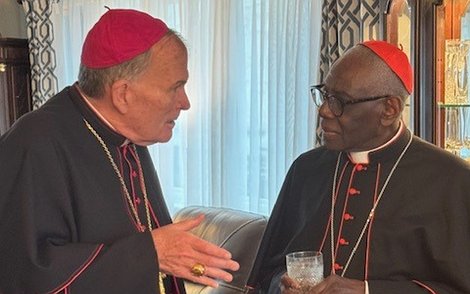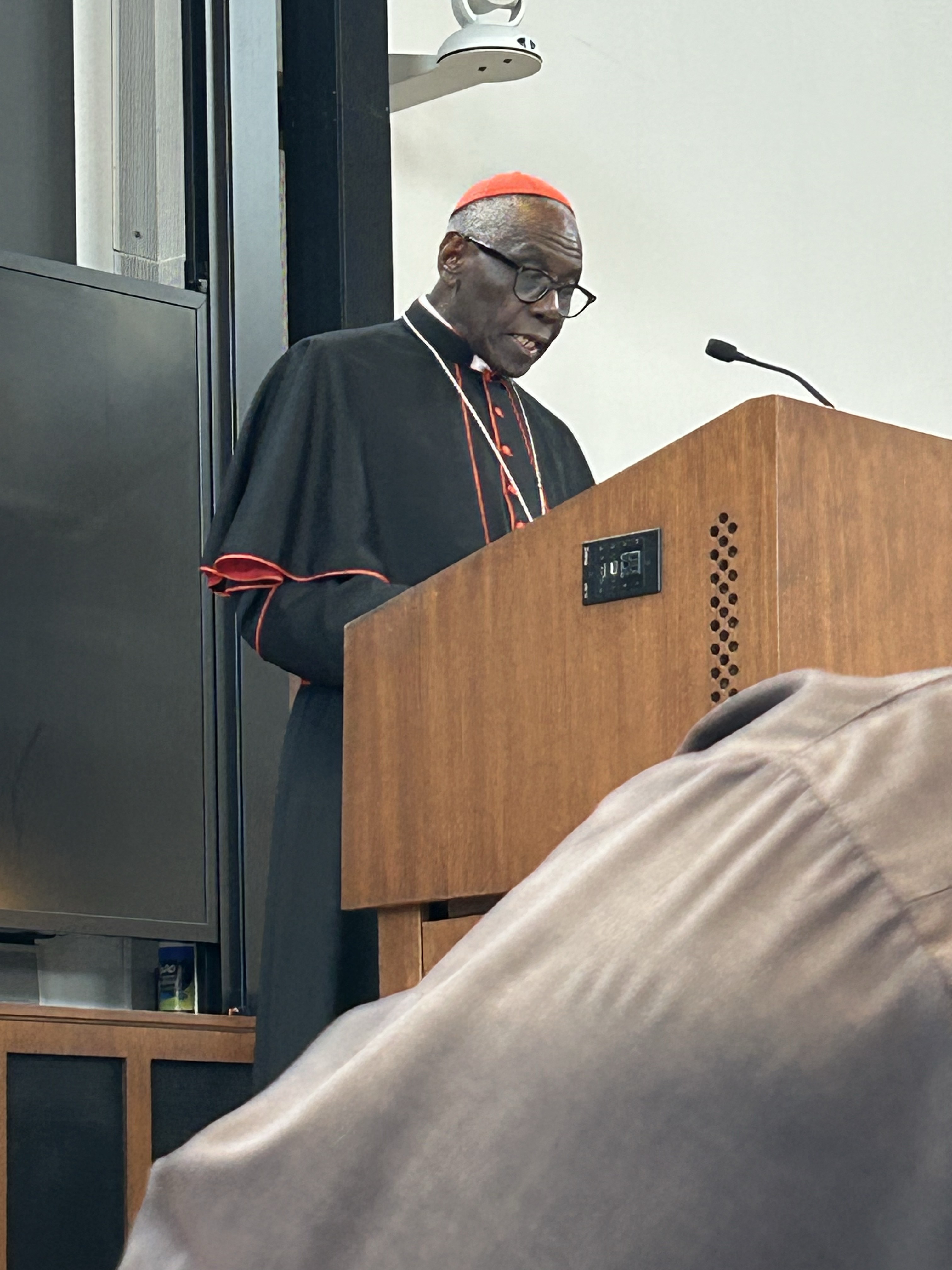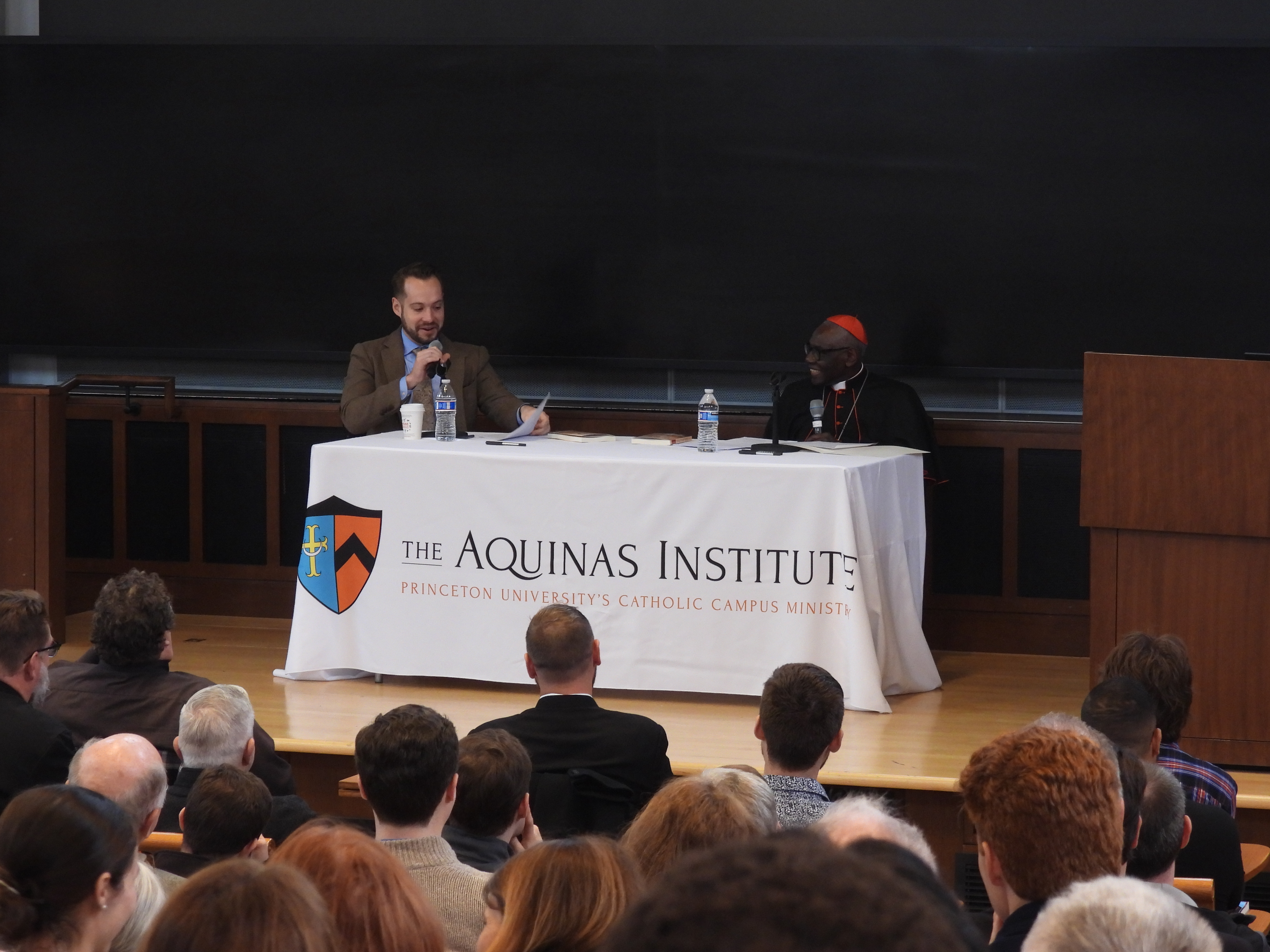 Cardinal Robert Sarah, a member of multiple dicasteries and pontifical councils, gave a presentation Nov. 22 at Princeton University on “The Song of the Lamb: Sacred Music and Heavenly Liturgy,” the newly released book he co-authored with Peter Carter, director of sacred music at the Aquinas Institute, the university’s Catholic campus ministry. Bishop David M. O’Connell, C.M., was on hand to welcome the Cardinal and shared a luncheon with him and attending clergy.