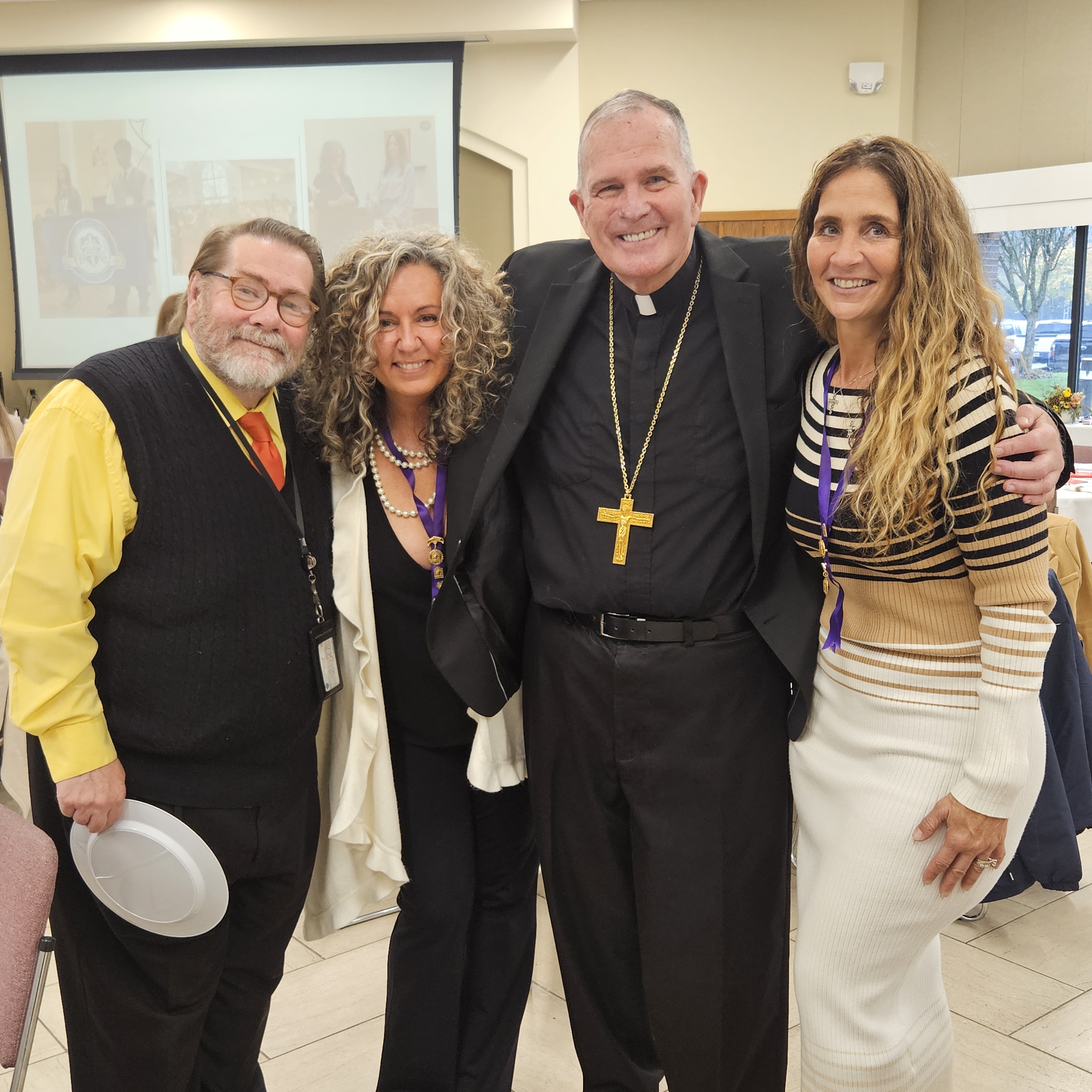 From left, Dan O'Connell, assistant superintendent of curriculum and instruction in the Diocesan Department of Catholic Schools, Jessica Jarmer, current diocesan PTA president, and Elia Landino, who served as PTA president for the 2021-2024 term, pose for a photo with Bishop O'Connell during the breakfast meeting. The council's century milestone was commemorated in a prayerful and festive manner Oct. 11 when Bishop David M. O'Connell, C.M., and diocesan school officials, current and former PTA council members as well as representatives from the Diocese's Catholic schools came together Oct. 11 in St. Robert Bellarmine Co-Cathedral, Freehold, for a Mass of Thanksgiving and celebratory breakfast meeting.