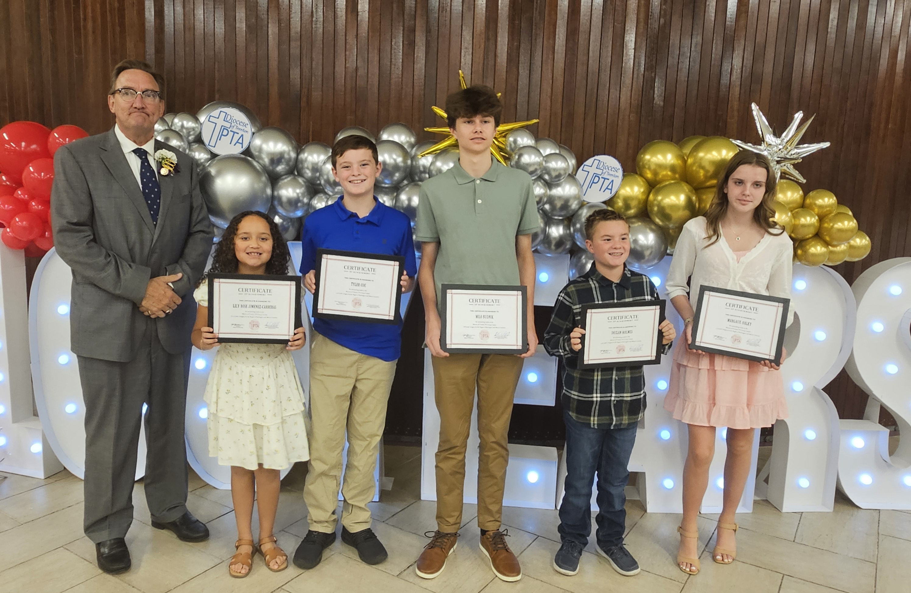 Dr. Vincent de Paul Schmidt, left, poses for a photo with the student winners of the essay contest sponsored by the Diocesan Council of Parent Teacher Associations.