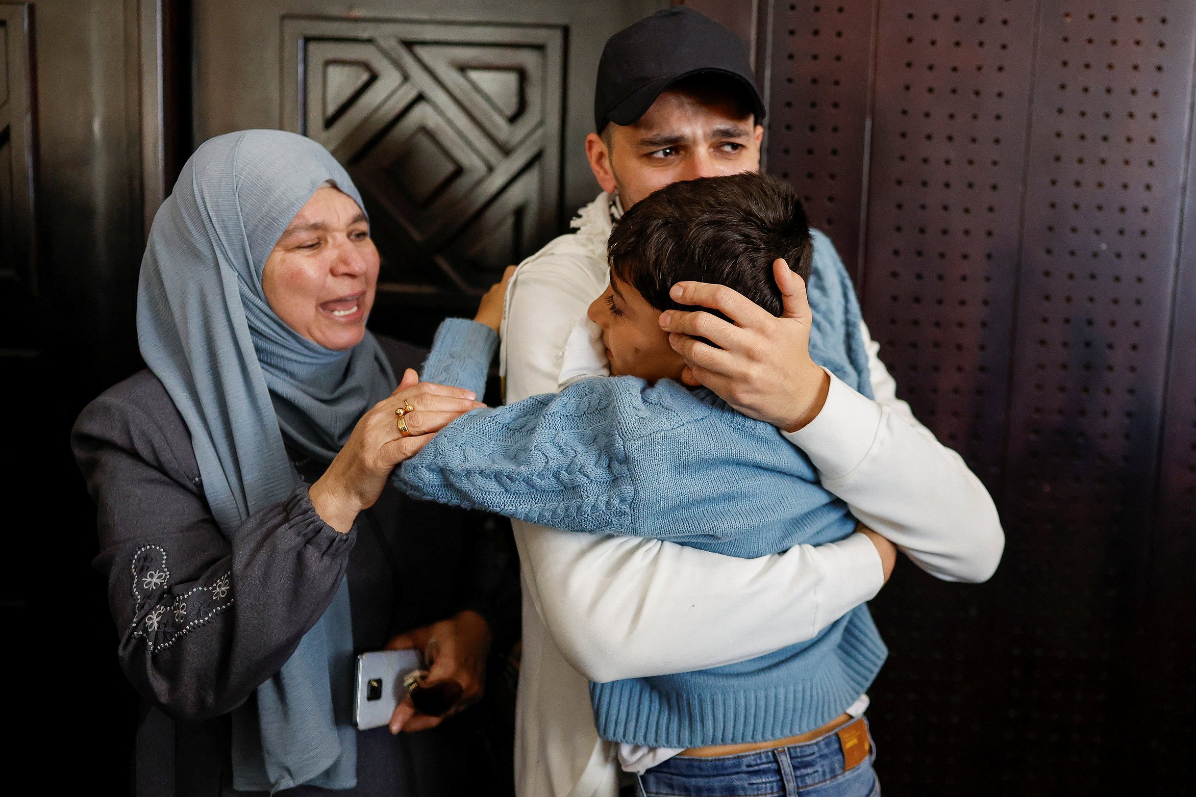 A freed Palestinian prisoner is greeted by his family member in Ramallah, in the Israeli-occupied West Bank, Oct. 13, 2025, after being released from an Israeli jail as part of a hostages-prisoners swap and a ceasefire deal in Gaza between Hamas and Israel. (OSV News photo/Ammar Awad, Reuters)..Ammar Awad