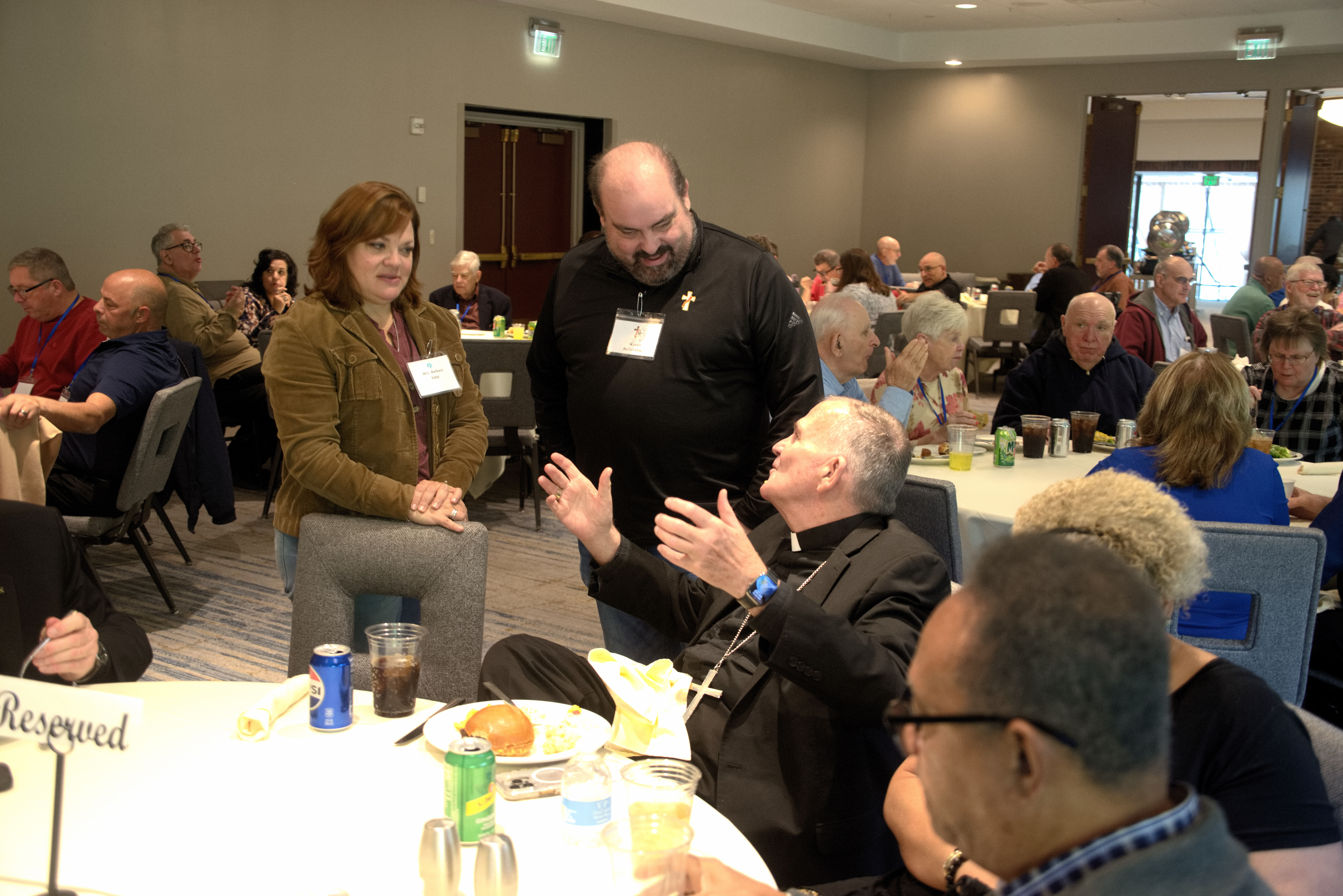 During breakfast Bishop O’Connell greets Deacon Robert and Barbara Vidal of St. Mary Parish, Barnegat.