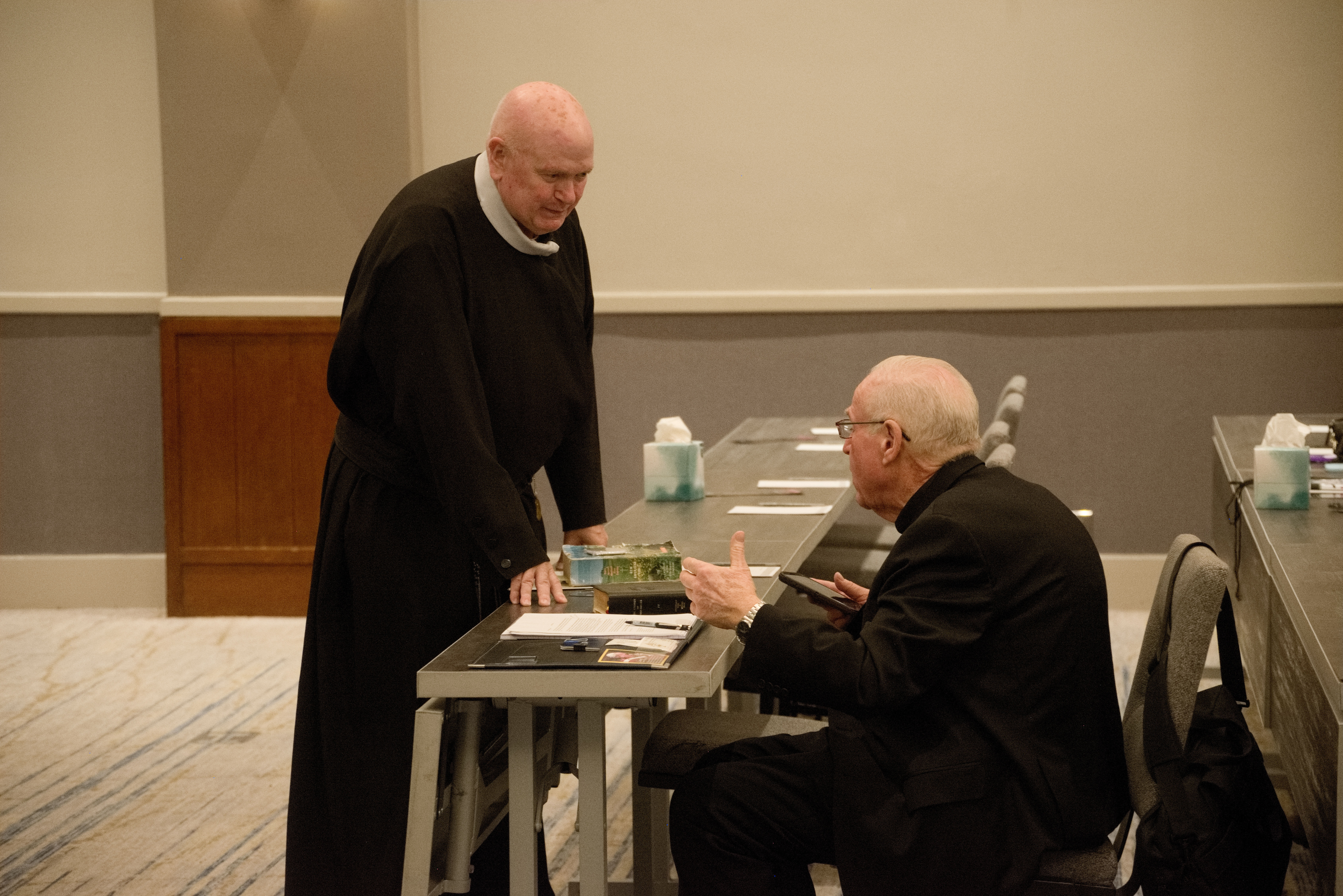 Redemptorist Father James Dowds, the convocation’s keynoter, left, enjoys conversation with Msgr. Thomas Mullelly, episcopal vicar of Clergy and Consecrated Life and director of seminarians.