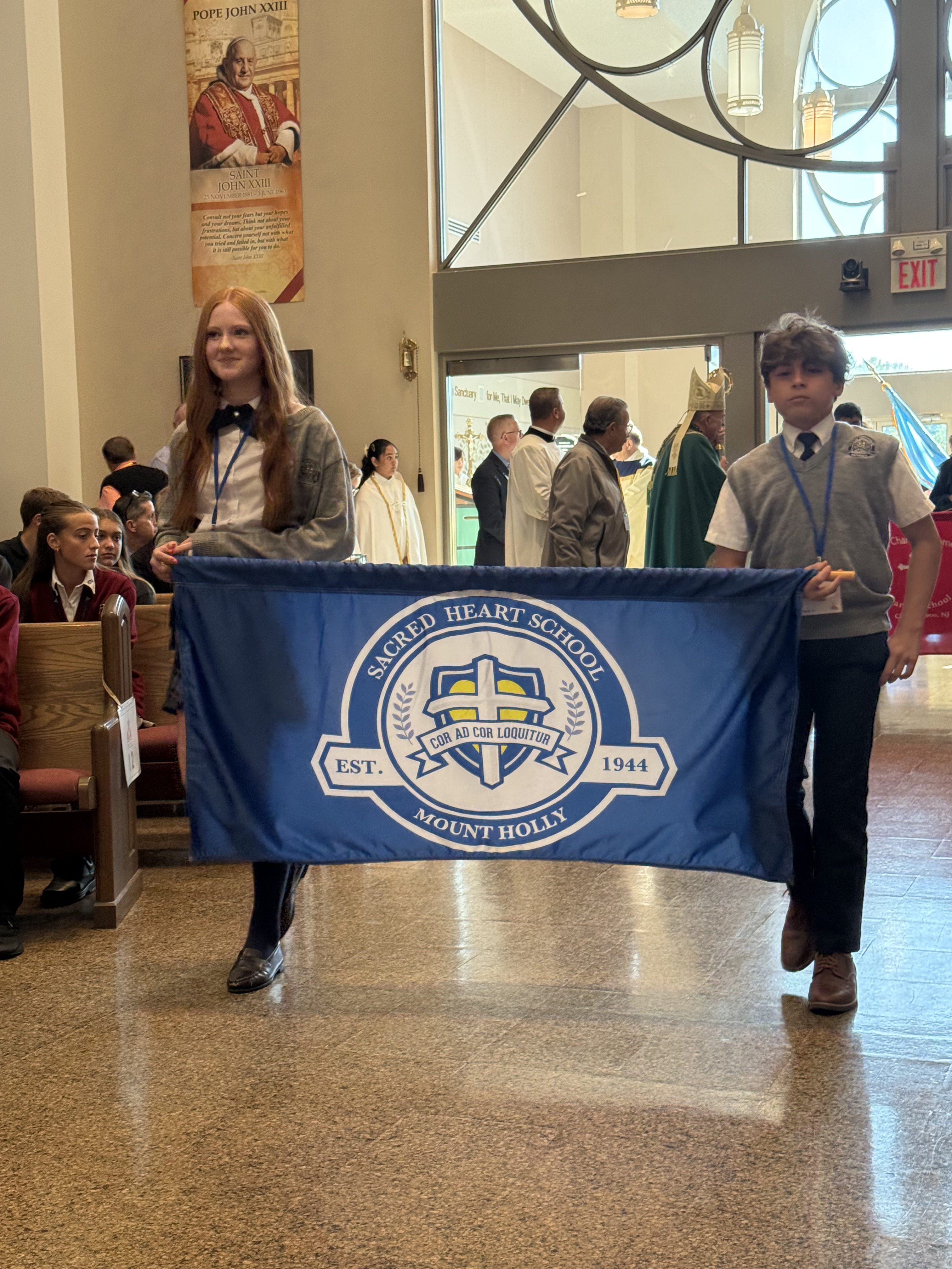 Students from Sacred Heart School, Mount Holly, carry their school banner at the start of Mass. Rose O'Connor photo