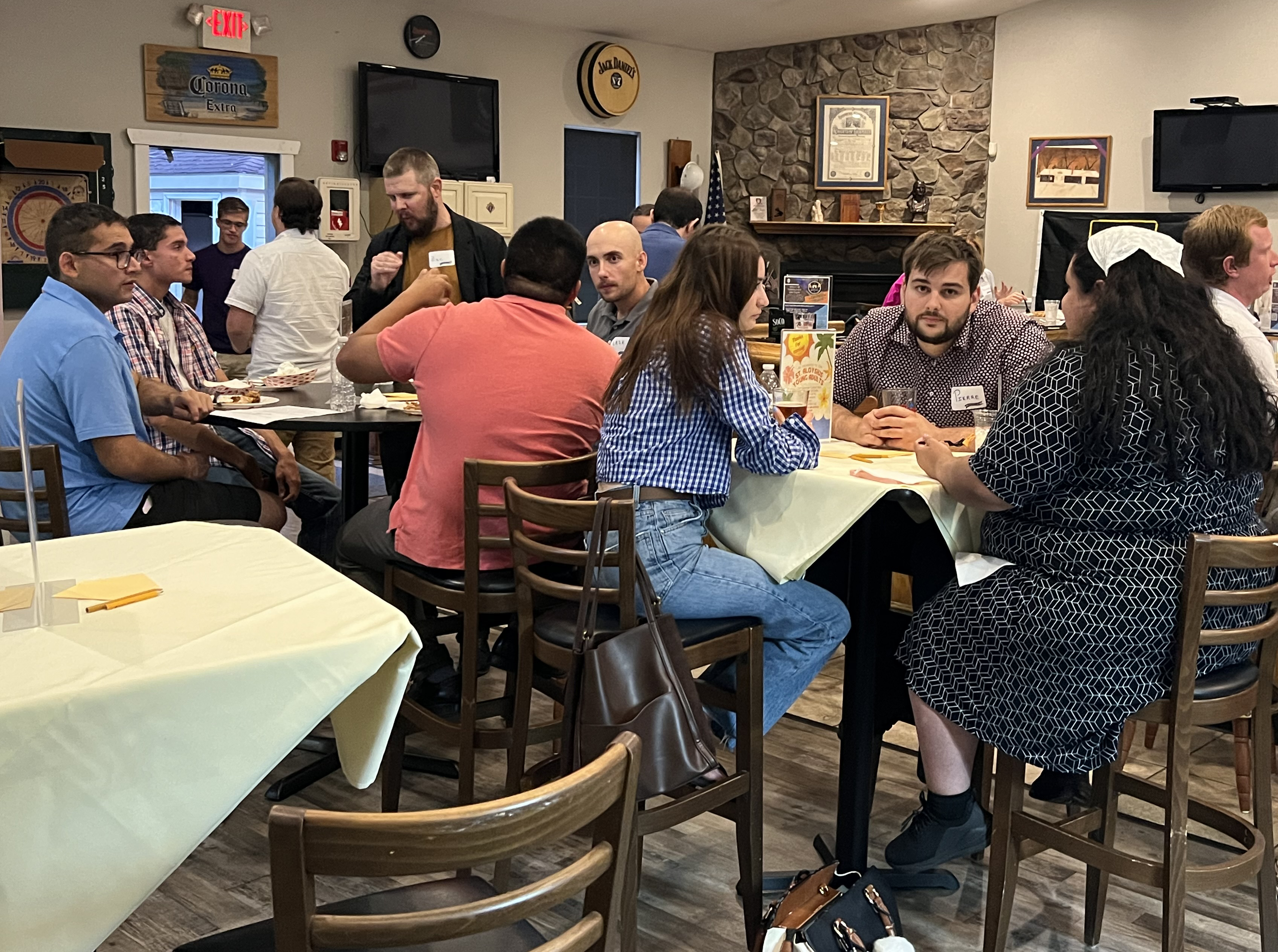 Attendees take time to share conversation during the Theology Tap event held Aug. 26.