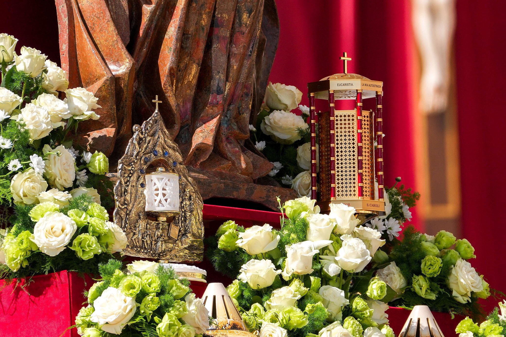 Los relicarios que contienen las reliquias de San Carlo Acutis y San Pier Giorgio Frassati se encuentran a los pies de una estatua de María durante la Misa de canonización celebrada por el Papa León XIV en la plaza de San Pedro del Vaticano el 7 de septiembre de 2025. (Foto CNS/Lola Gomez)Lola Gomez