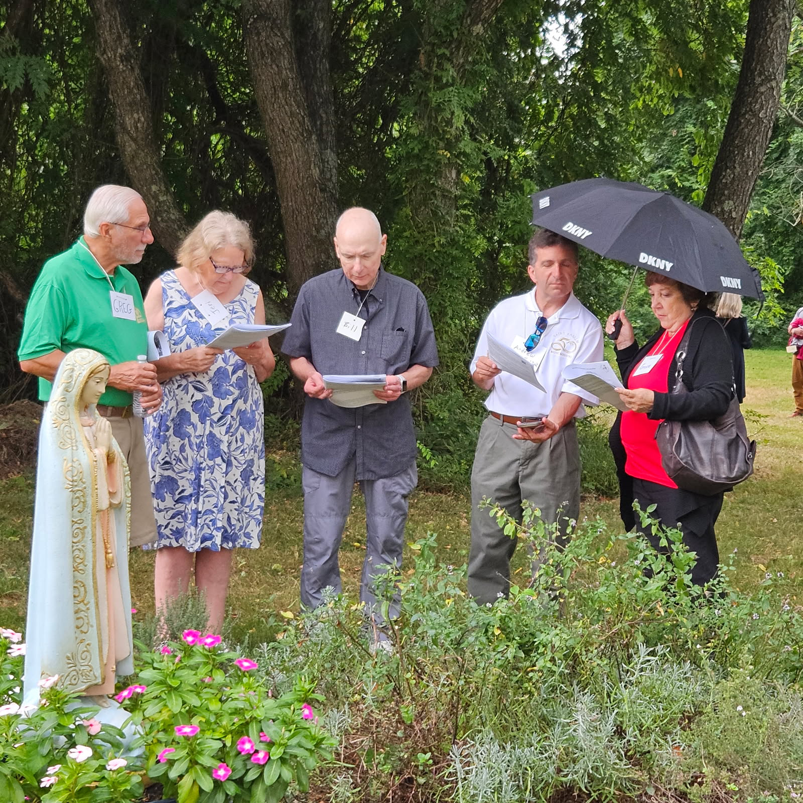 Persons who are active in caring for creation and environmental ministries in their parishes from around the Diocese participate in an outdoor Pilgrimage Hope for Creation Prayer Walk on the grounds of St. Anselm Parish, an activity designed to raise awareness as well as to reflect on environmental concerns. Here a group spends time in prayer and reflection at the Mary herb garden. The pilgrimage moved indoors when it started to rain. Mary Stadnyk photo Noting that climate change, deforestation, pollution and ecological loss are not merely scientific or political issues, but are spiritual issues, the Bishop said, adding, “They are a summons to faith, a call to hope. The earth is not our possession. It is our brother, our sister, our home and hour hope.”