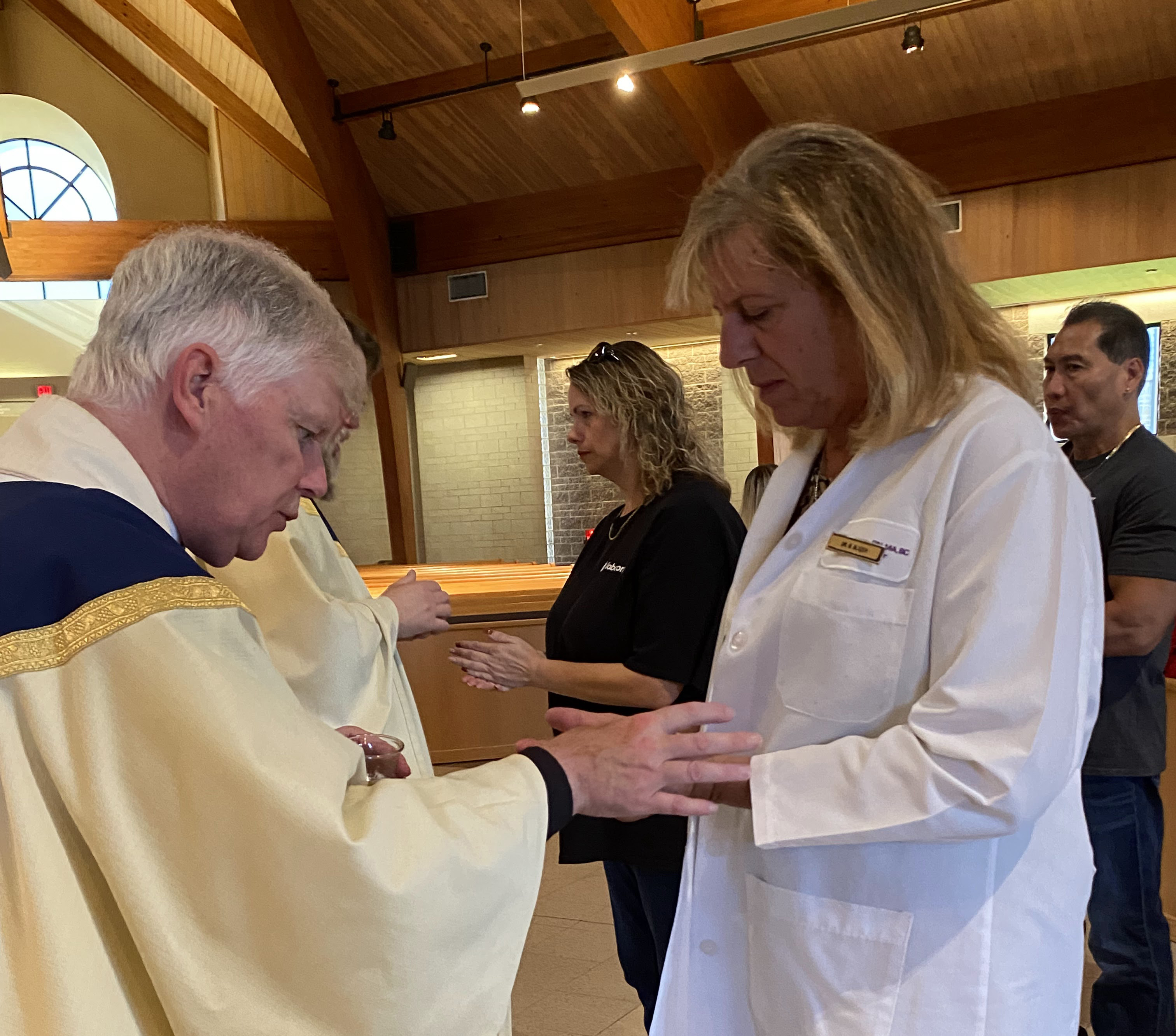 Father John Butler, pastor of St. Michael Parish, West End, blesses the hands of a healthcare worker during the 2024 White Mass. This year’s Mass is scheduled for Oct. 19 in St. Luke Church, Toms River. Monitor file photo