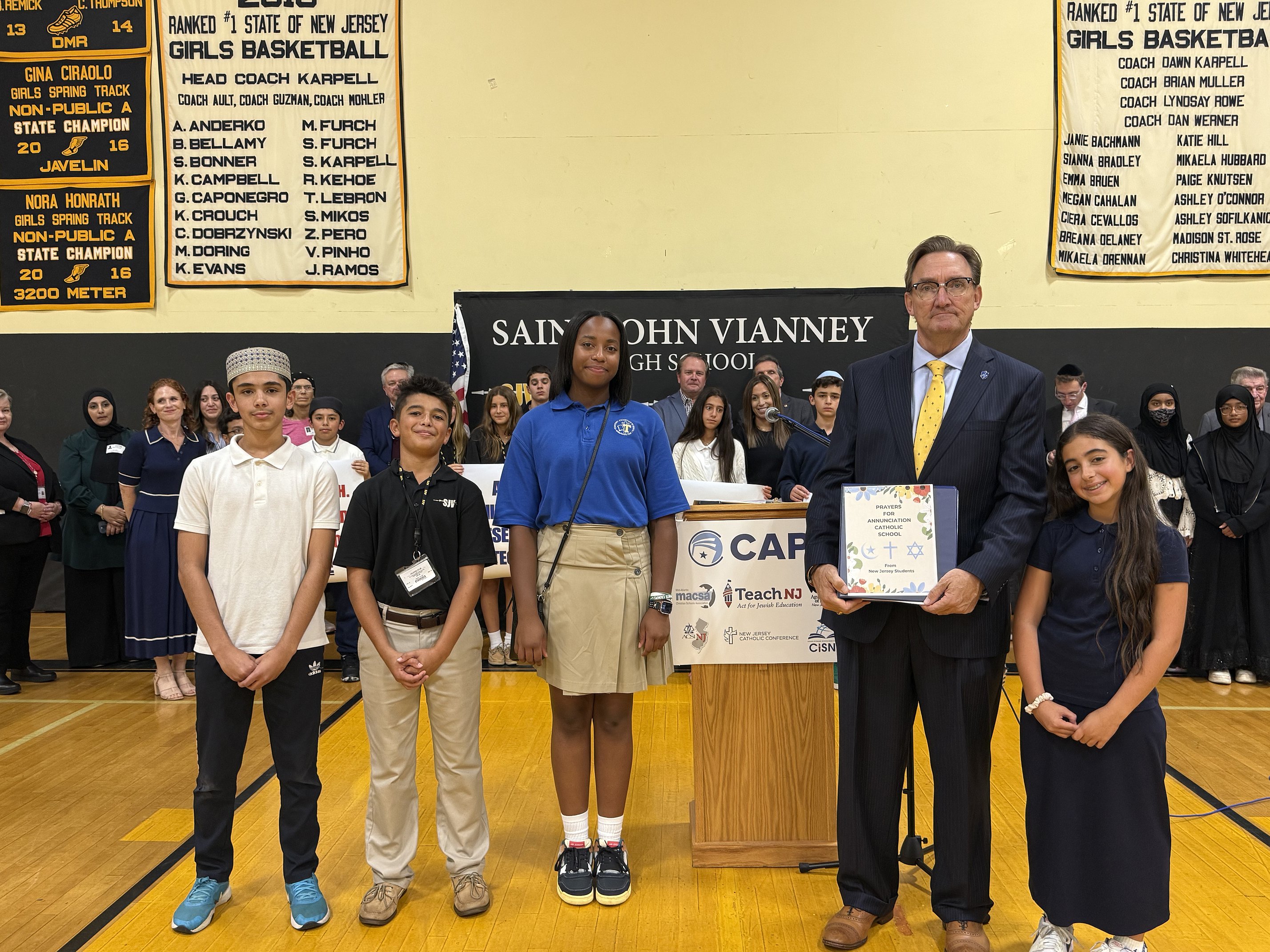 Students and leaders from Catholic, Jewish, Christian and Islamic schools gather Sept. 18 in St. John Vianney High School, Holmdel, for a statewide solidarity event hosted by the New Jersey Council for American Private Education and Teach NJ. The event, which included local and state lawmakers, emphasized the urgent need for school security funding and highlighted unity across faith traditions.Bonnie Milecki, assistant superintendent of Catholic schools in the Diocese of Trenton and president of NJCAPE, addressed the group, saying, “Sadly, our gathering today comes in the shadow of tragedy. Just weeks ago, Annunciation Catholic School (in Minnesota) experienced an attack that shook that community and reverberated through all of ours. When one school is targeted, every school shares the pain. That is why we are here. To stand together and say, ‘The safety of every child must be a shared priority.’”