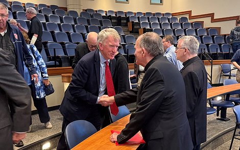 Bishop O’Connell greets Brian Browne, associate vice president for university communications and public affairs at St. John’s University, during Founder’s Week in Queens, N.Y., Sept. 22. To the Bishop’s right is the Rev. Patrick Griffin, executive director of the Vincentian Center for Church and Society. Staff photoRelated Stories