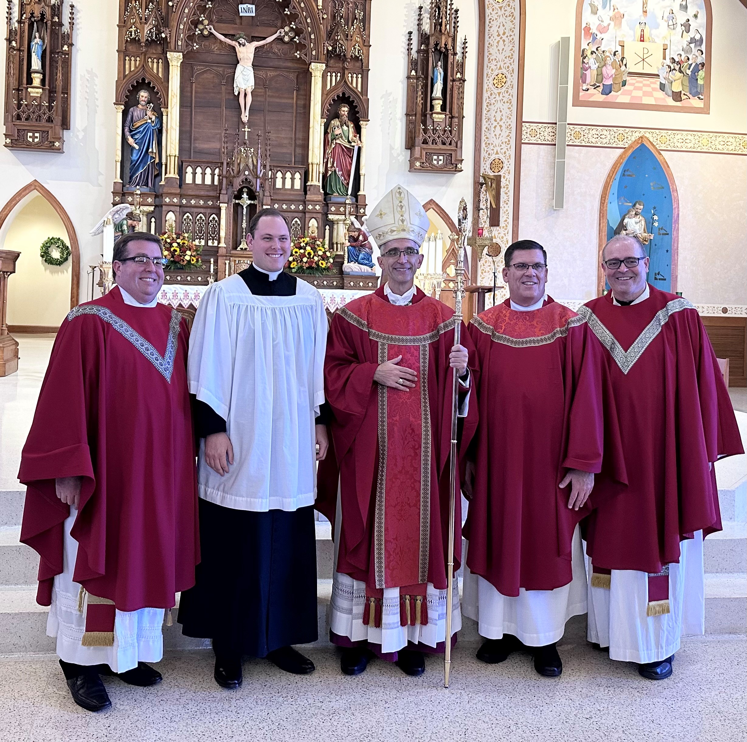 Kyle Holler poses for a photo with Bishop Cooke and other priests in attendance including Father Christopher Colavito, left, Trenton Diocesan director of vocations. Staff photo