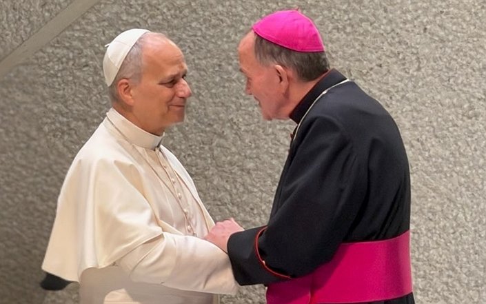 Bishop David M. O’Connell greets Pope Leo following the Pope’s General Audience, Jan. 7.